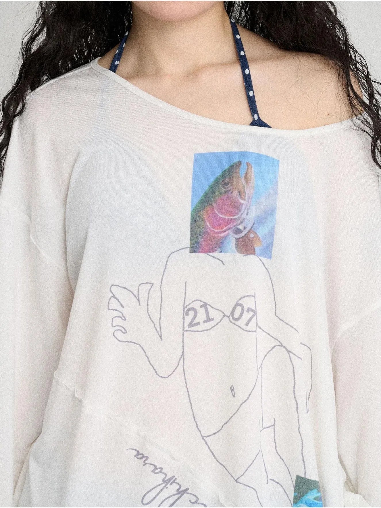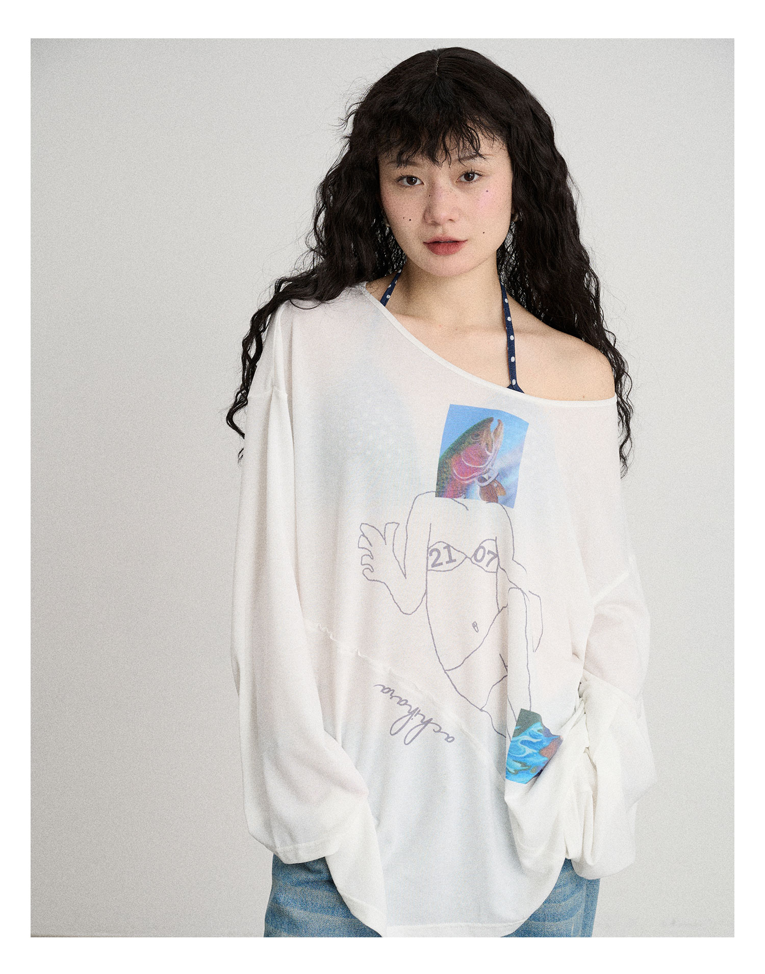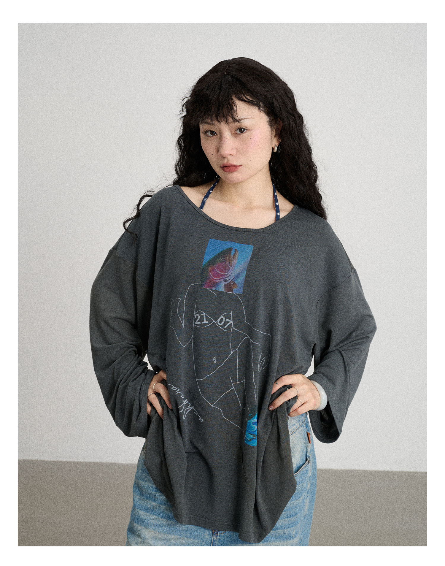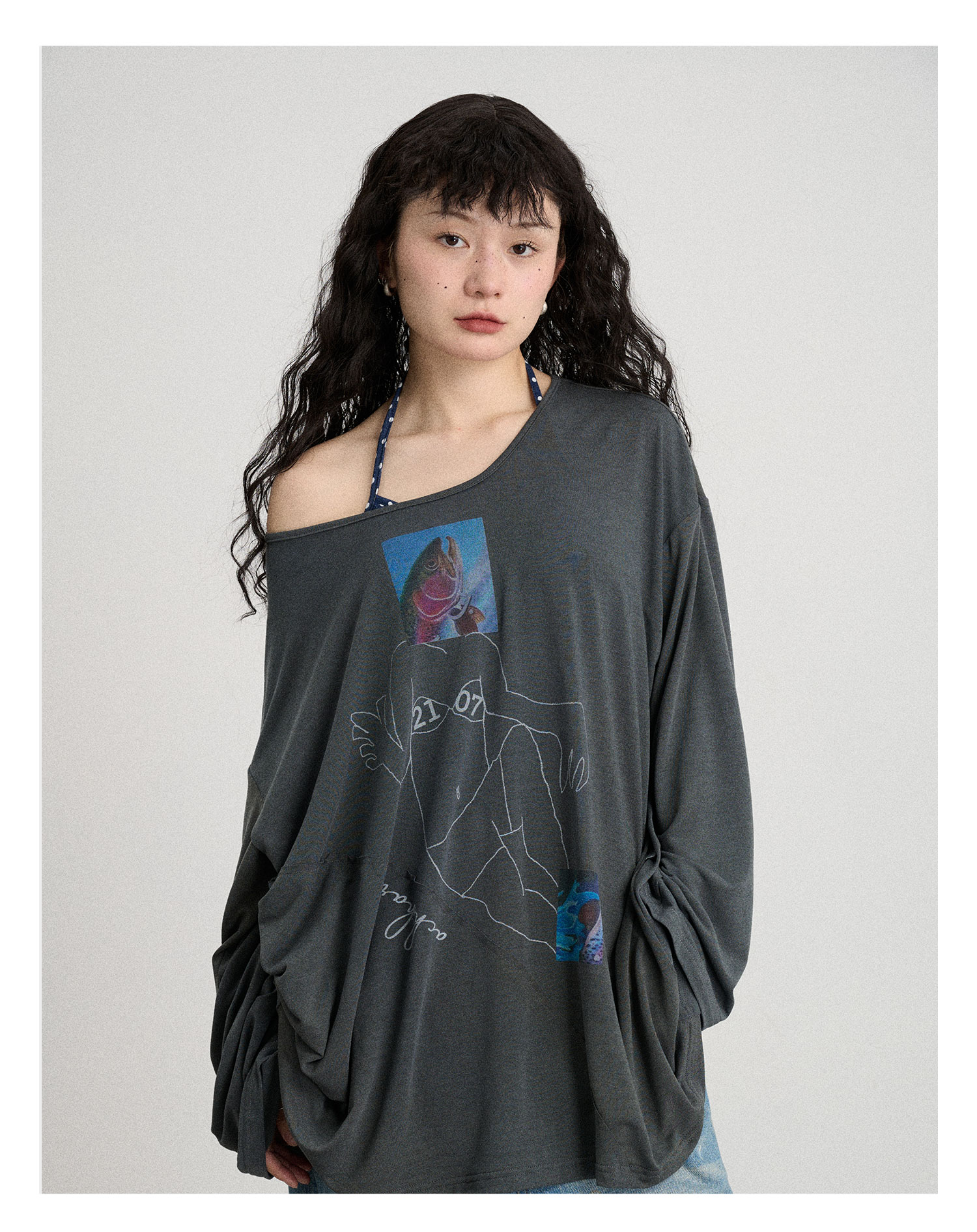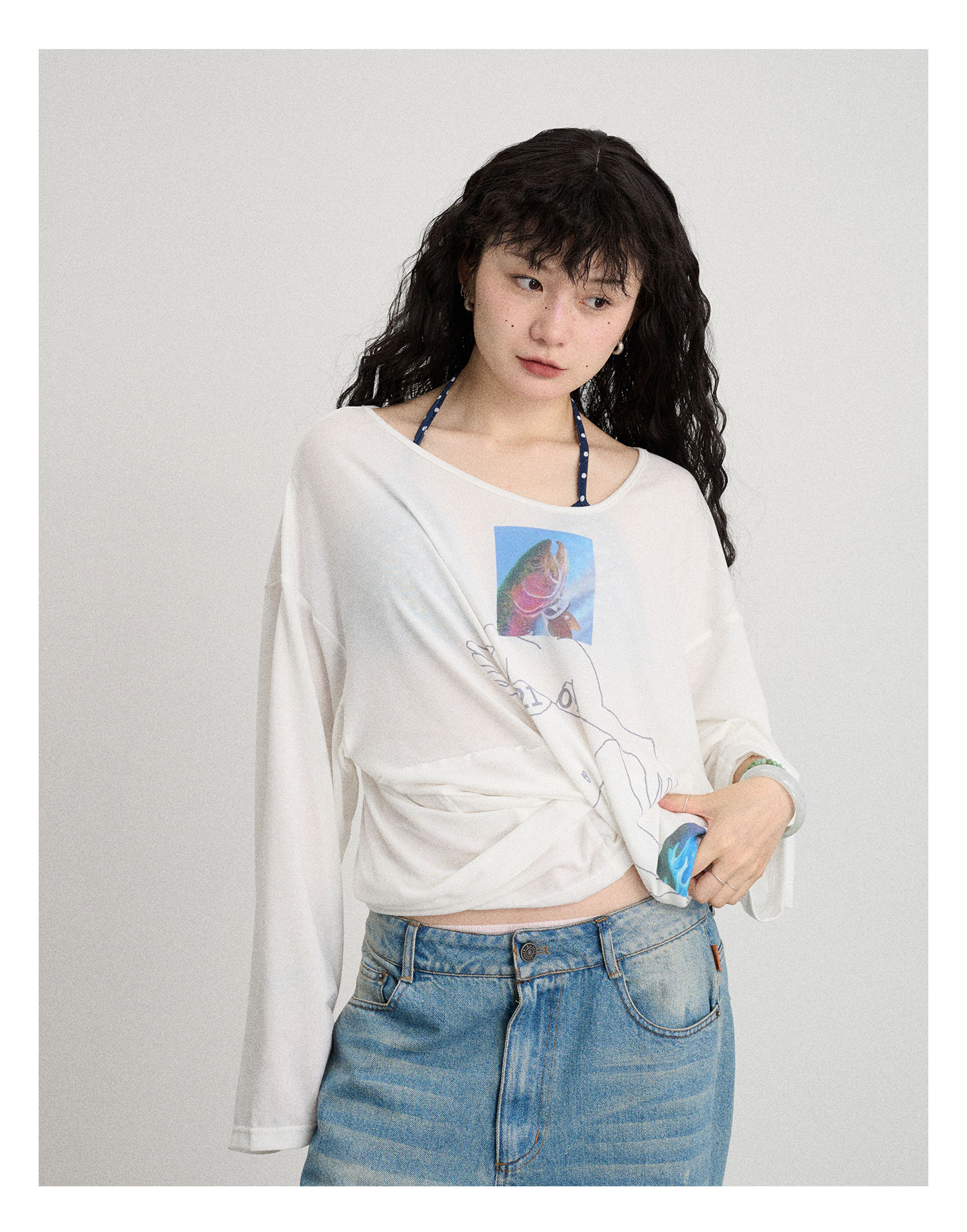 Fish Asymmetric Collar Loose Long-Sleeved T-Shirt