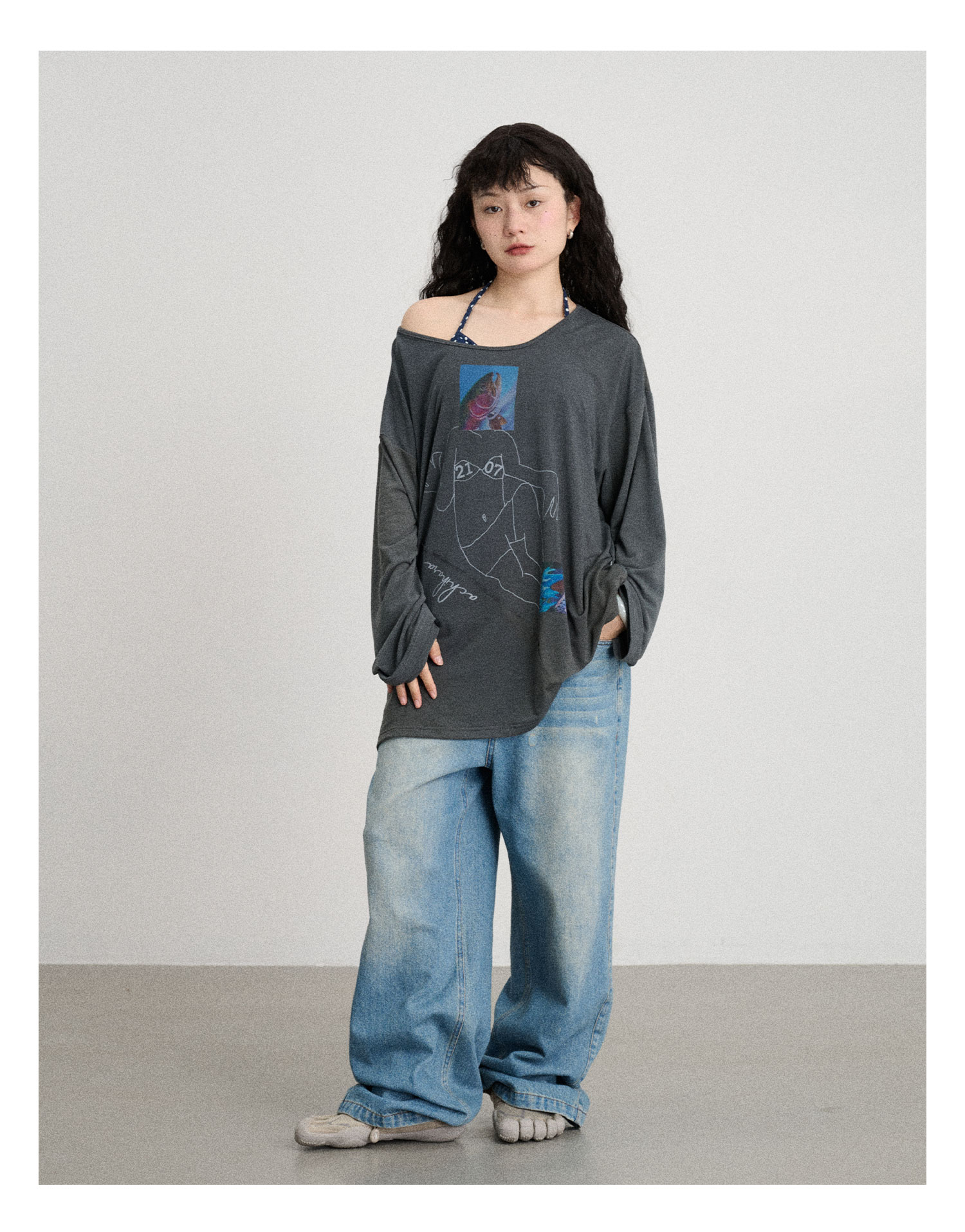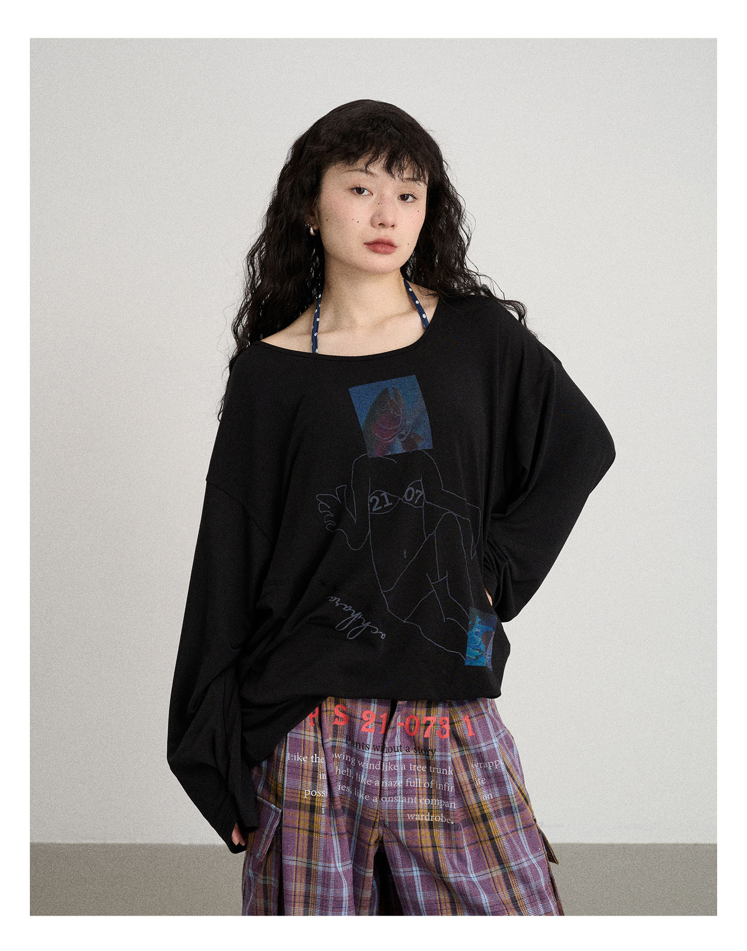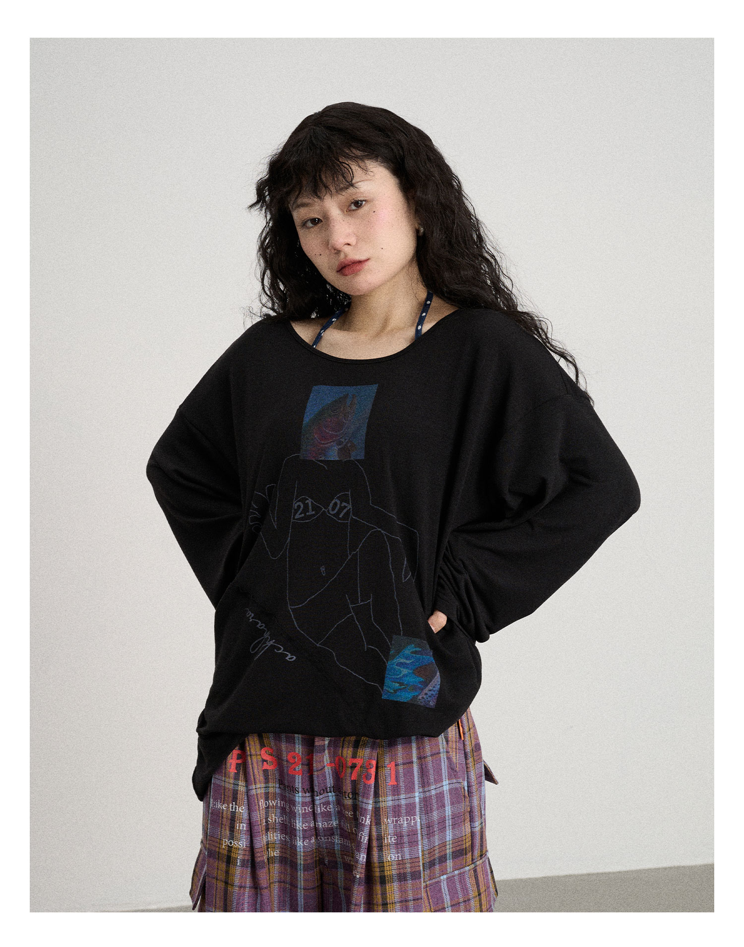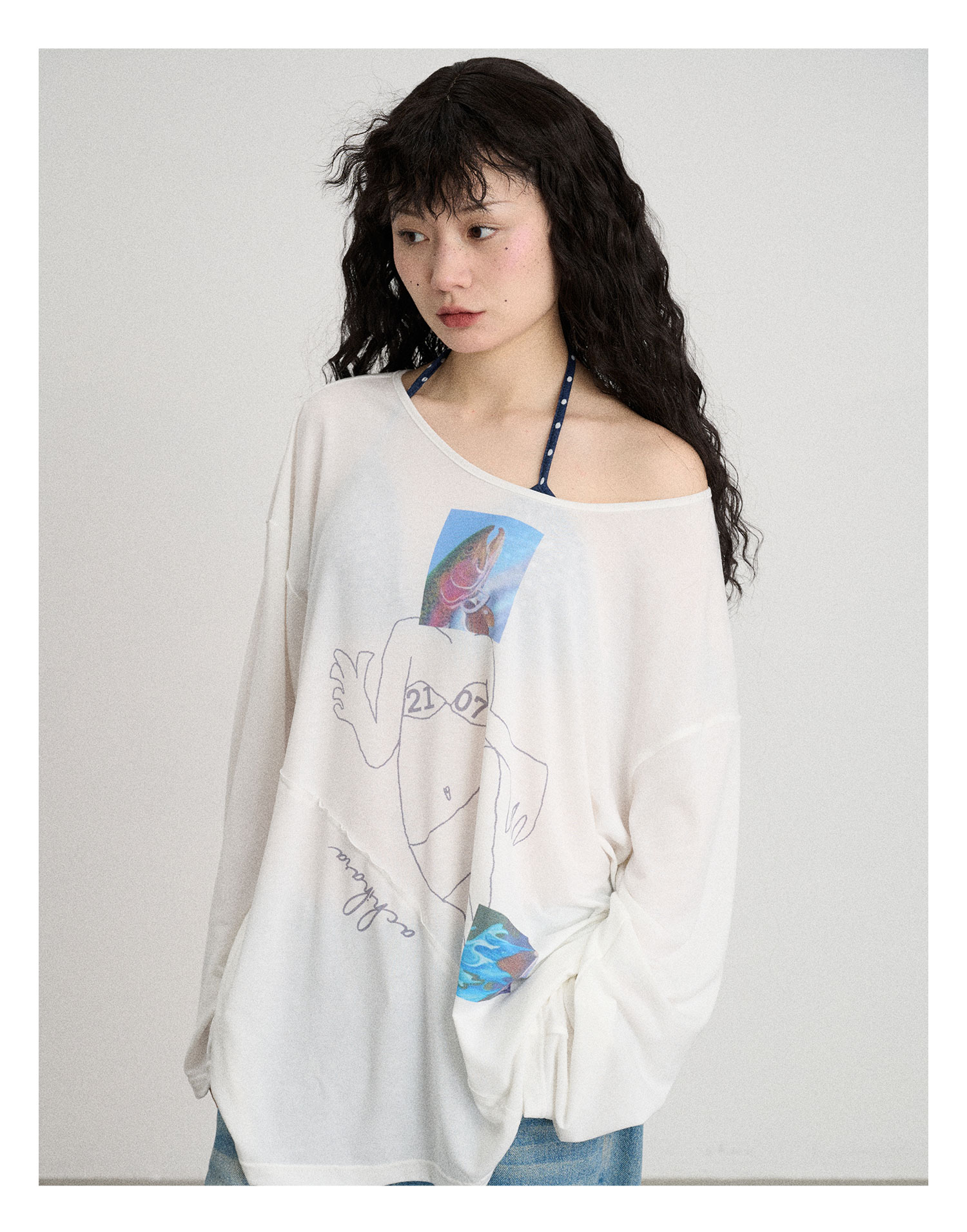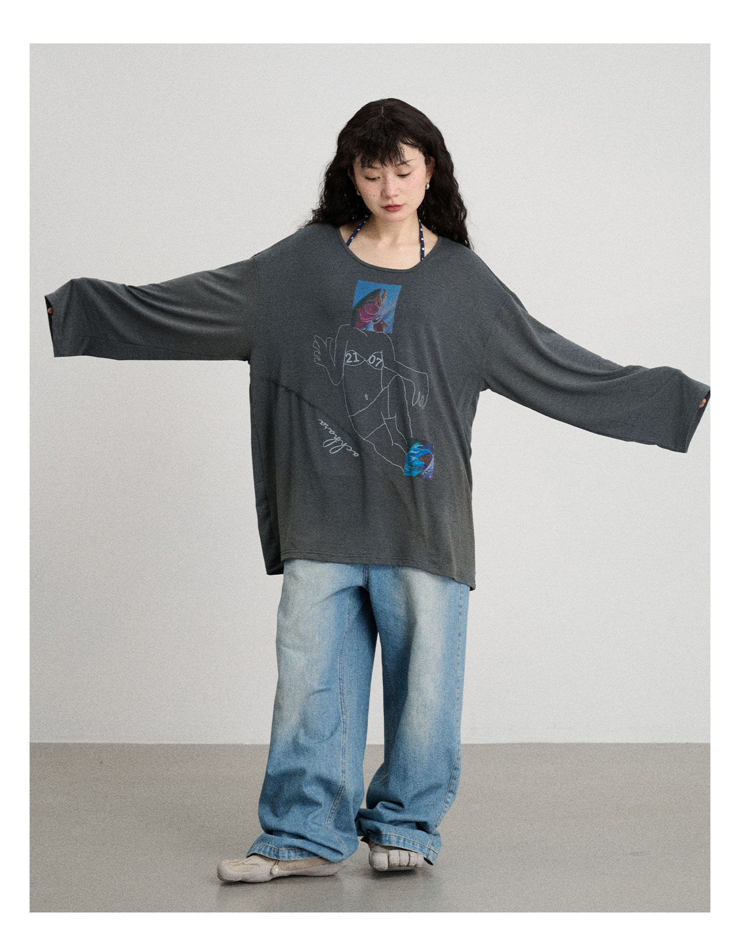 Fish Asymmetric Collar Loose Long-Sleeved T-Shirt