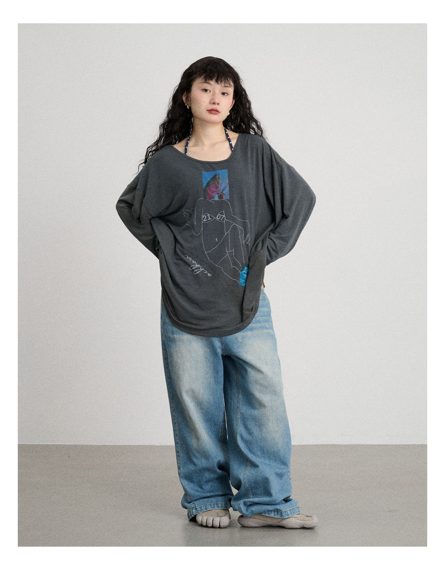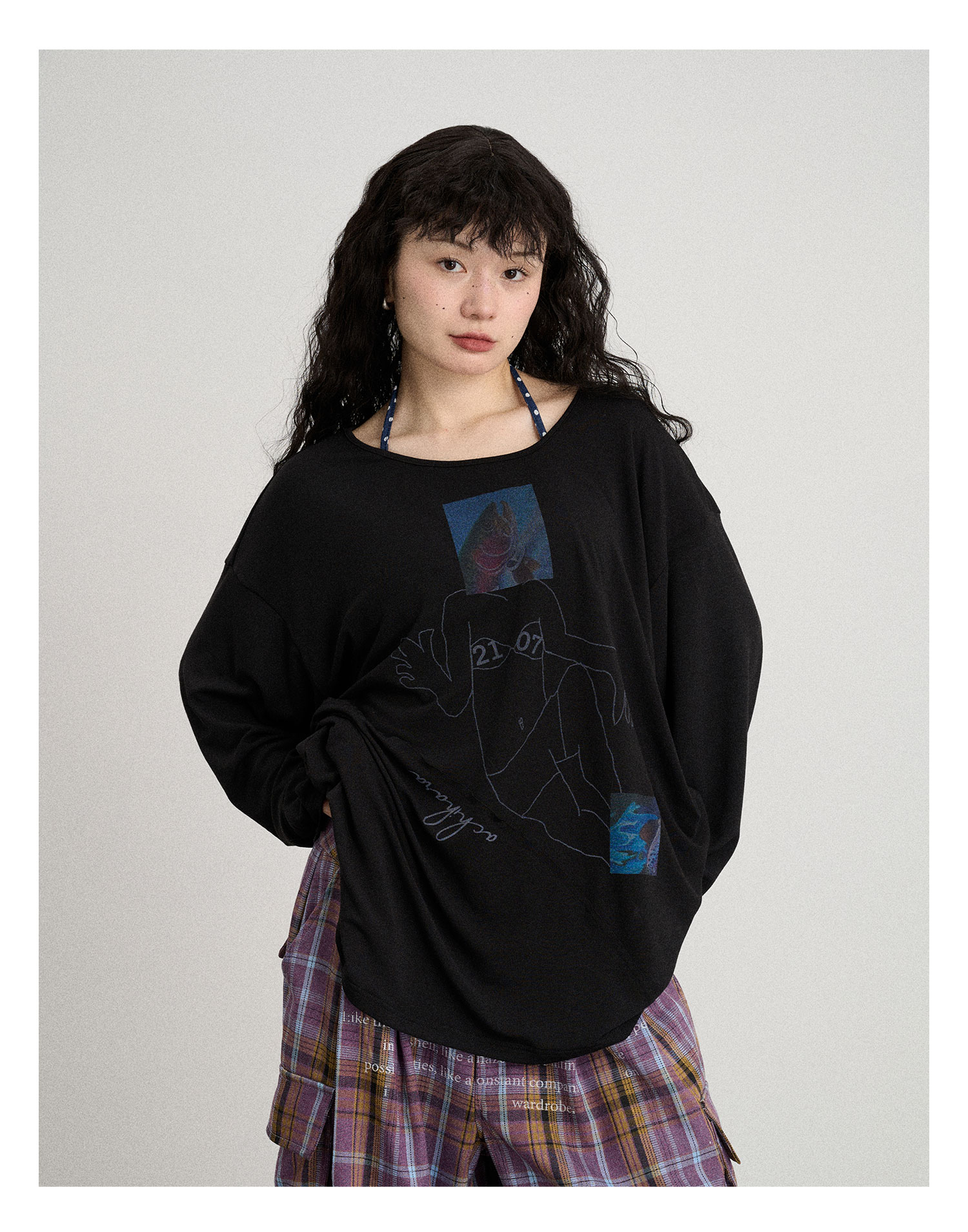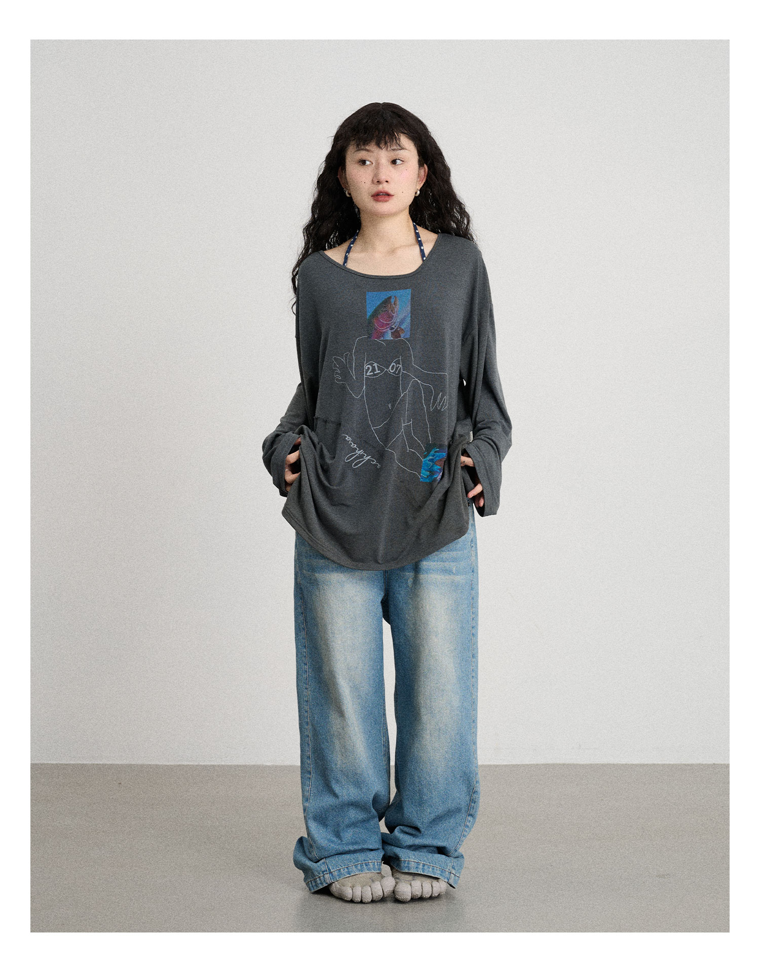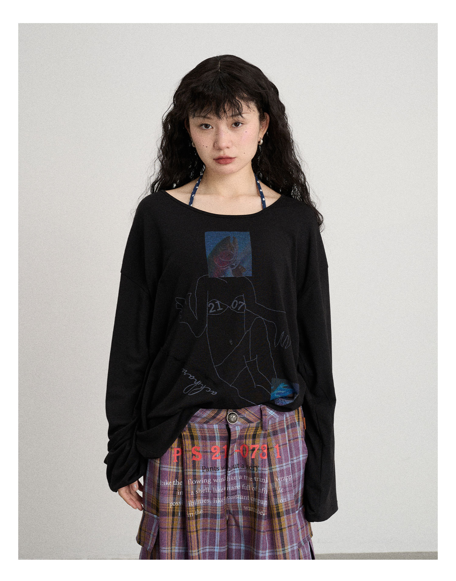 Fish Asymmetric Collar Loose Long-Sleeved T-Shirt