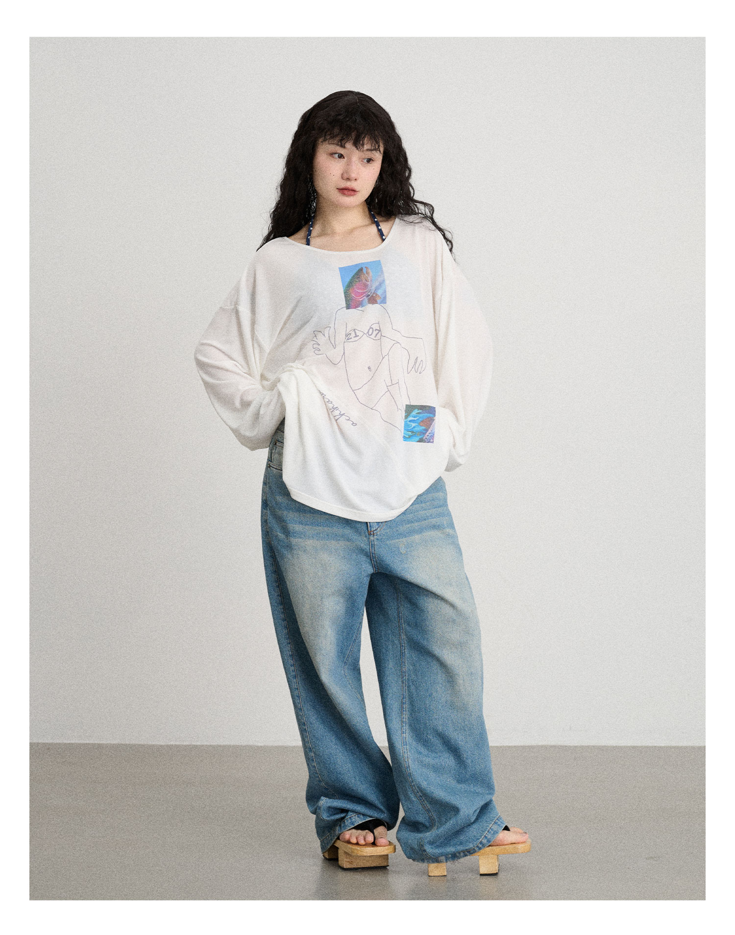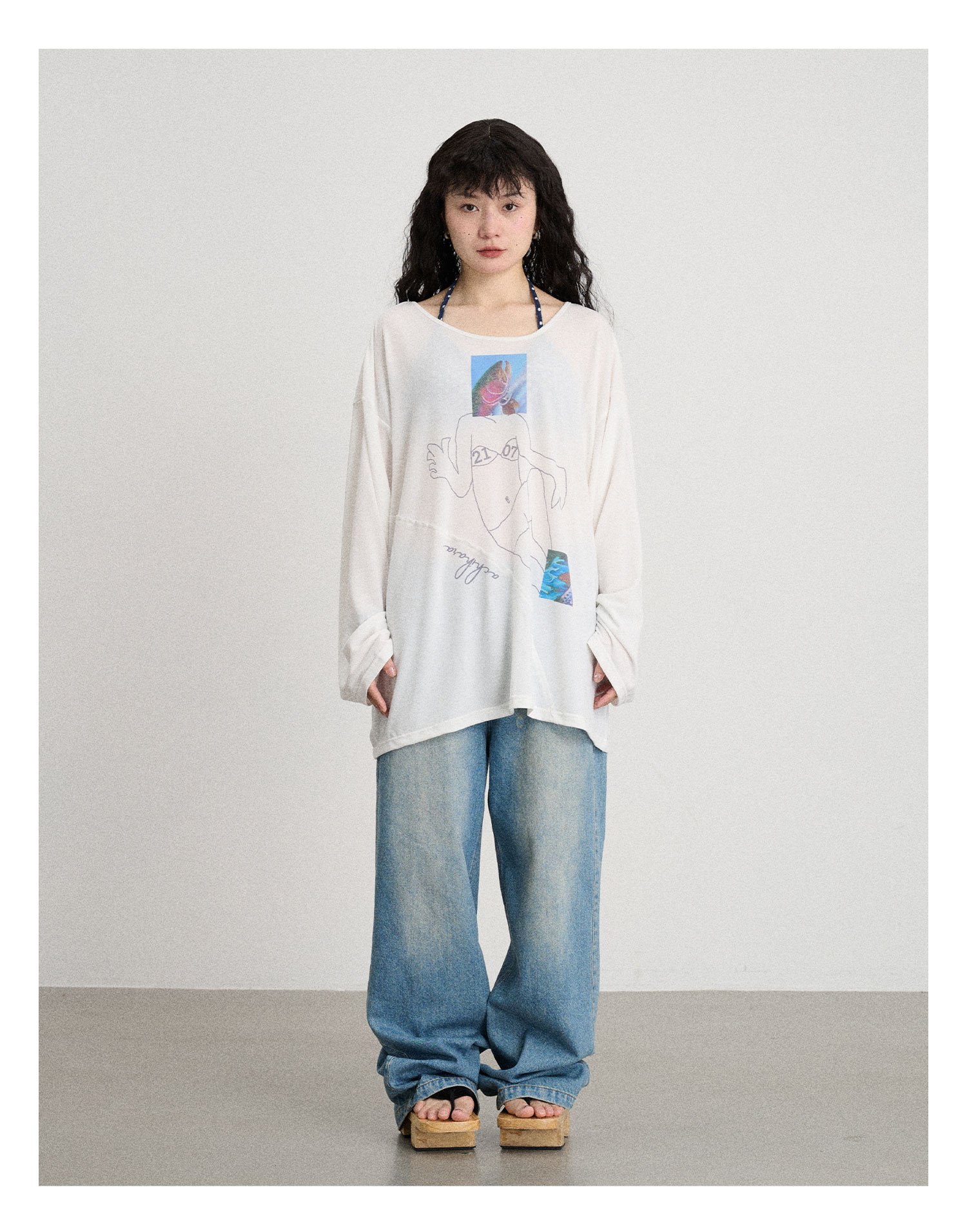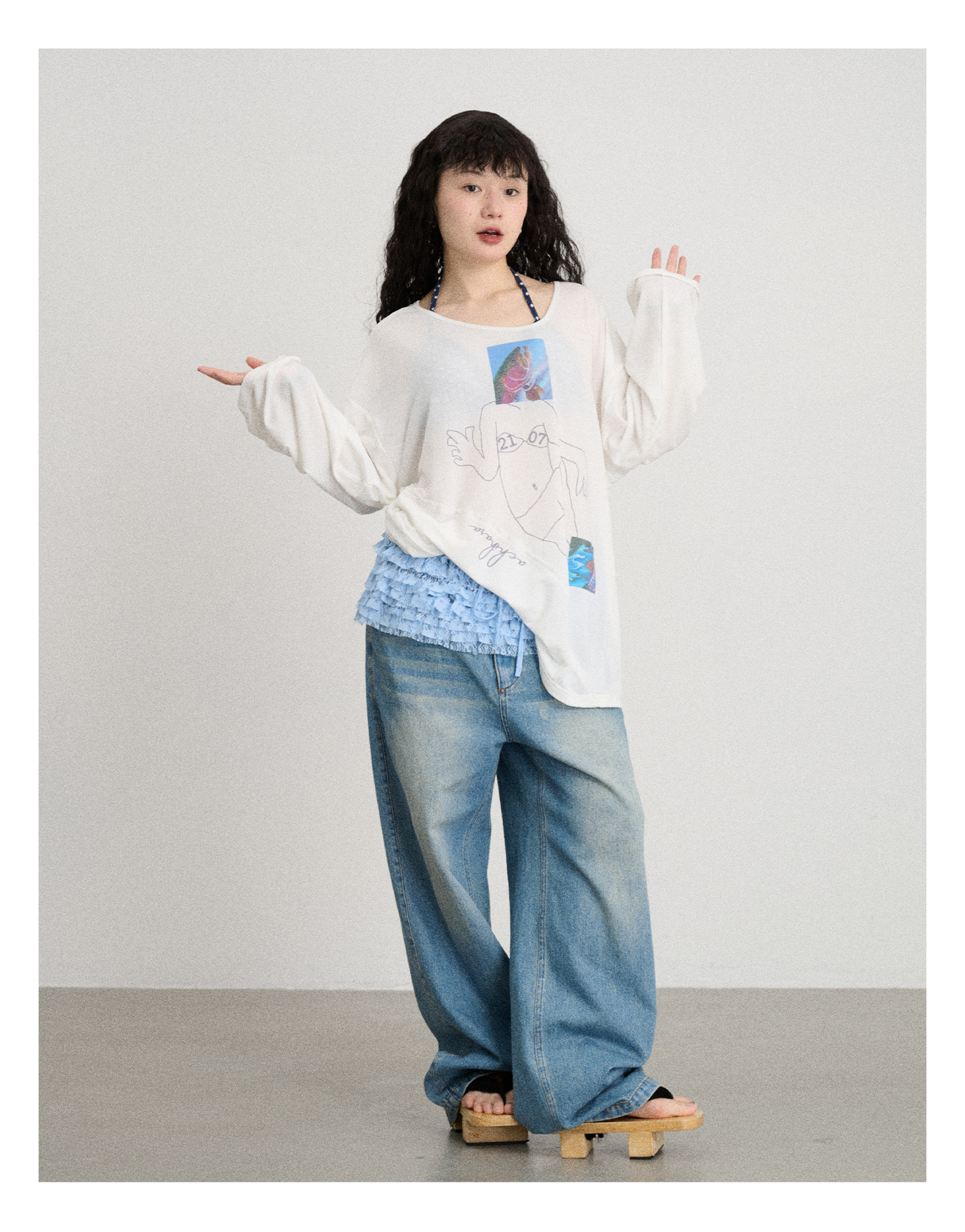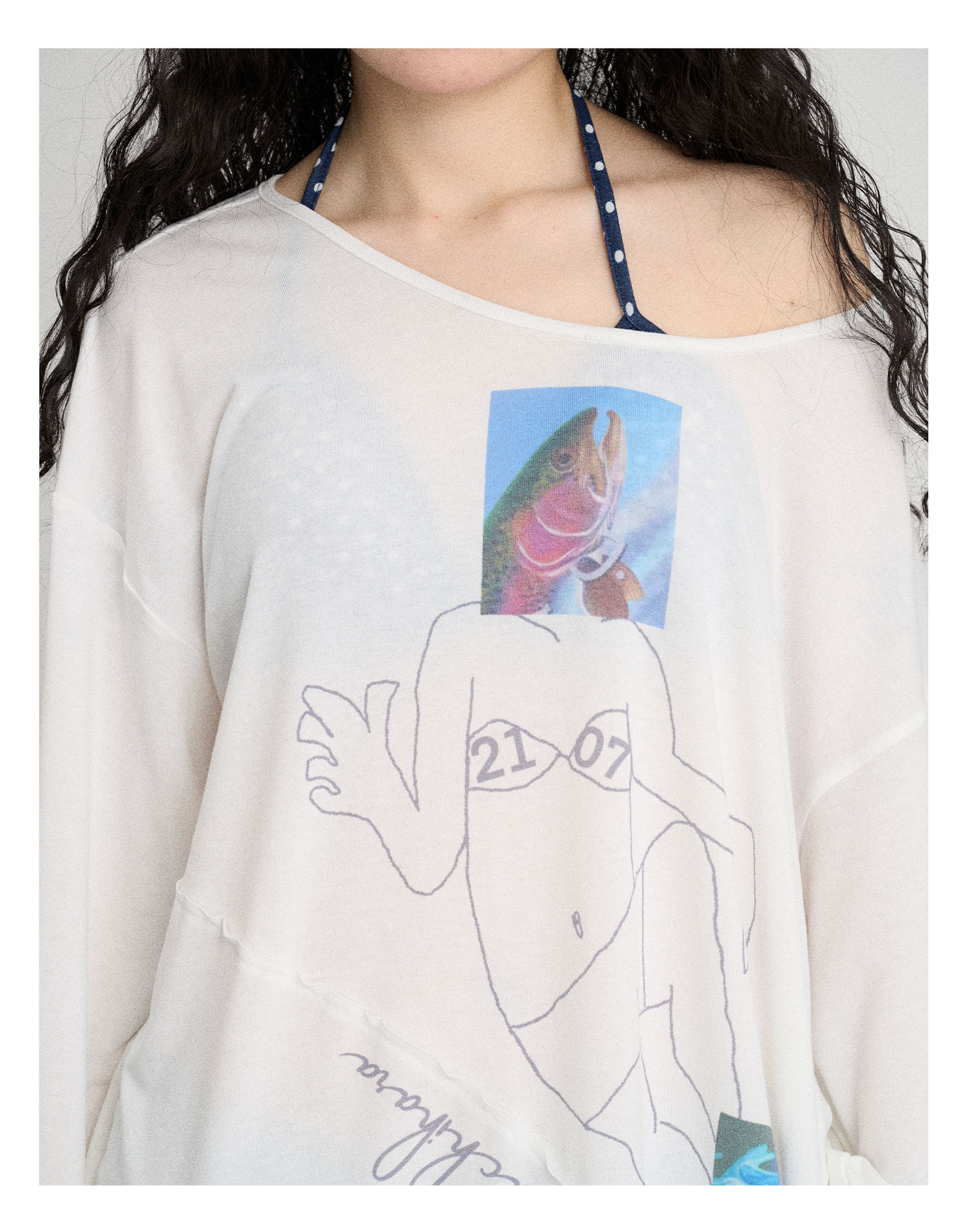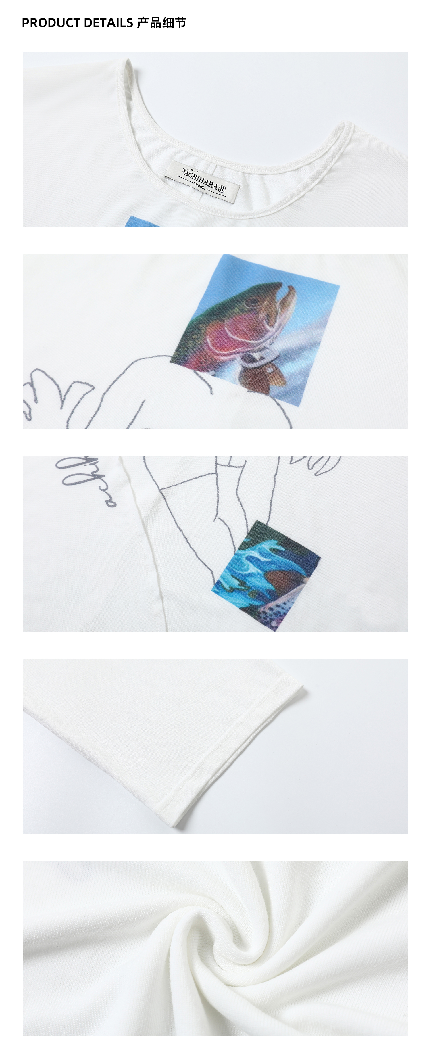 Fish Asymmetric Collar Loose Long-Sleeved T-Shirt