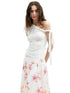Asymmetric off-shoulder diagonal cut highlighting collarbone and shoulder lines. Twisted knot sleeve cuff and included adjustable ribbon for multiple styling options (one-shoulder, diagonal shoulder, straight neckline). Fitted at the waist to shape curves; suitable for daily wear and dates.