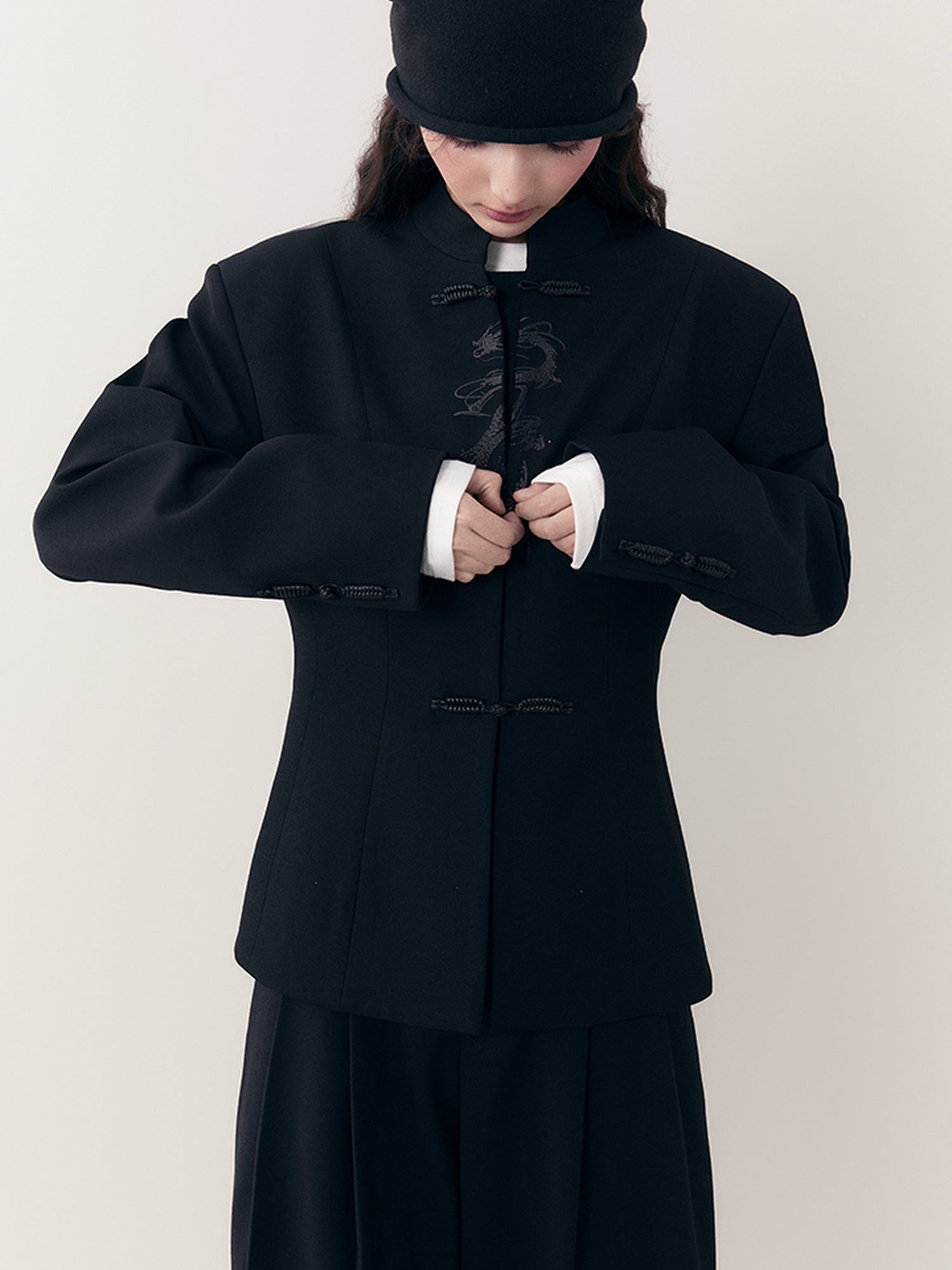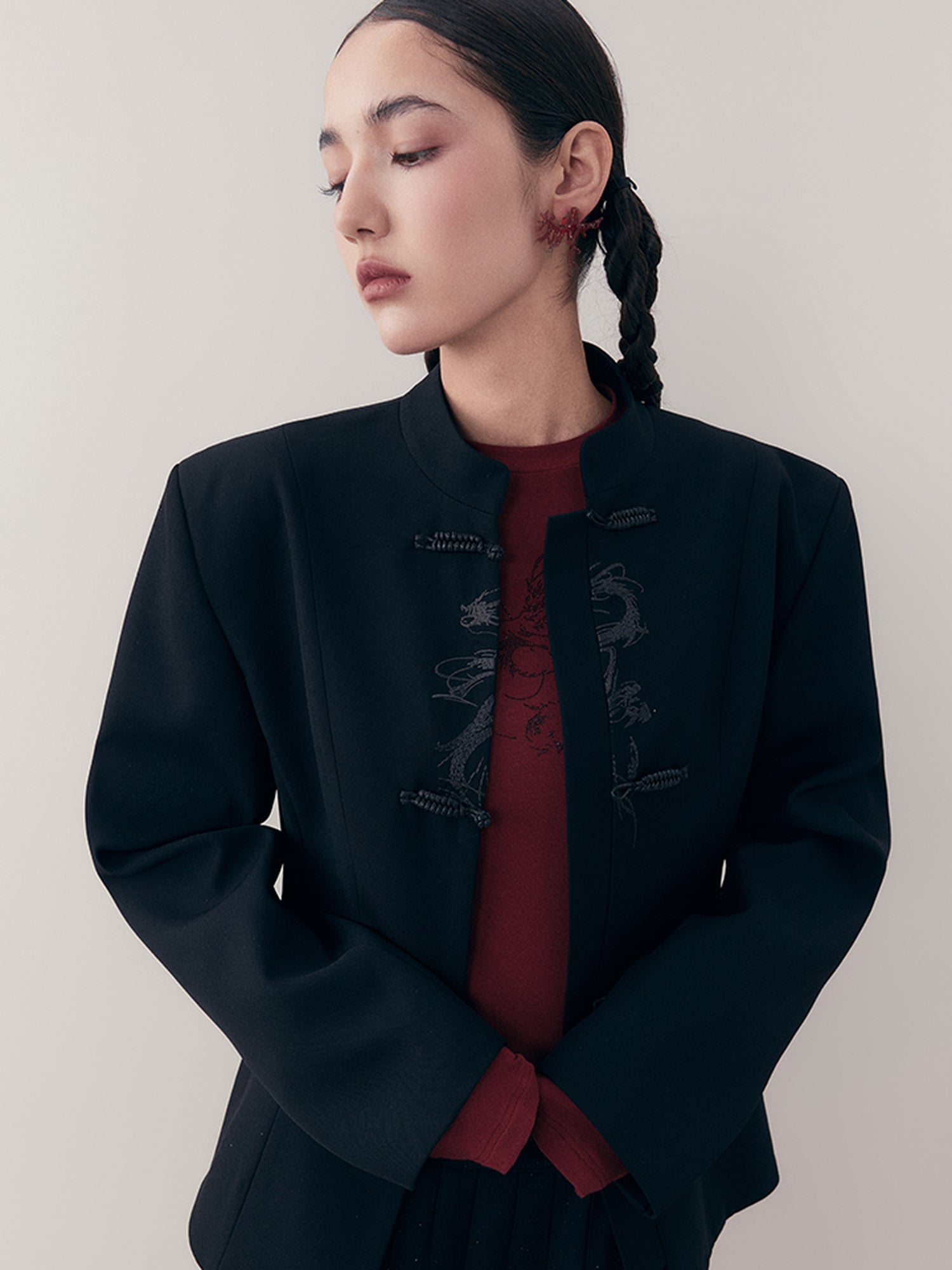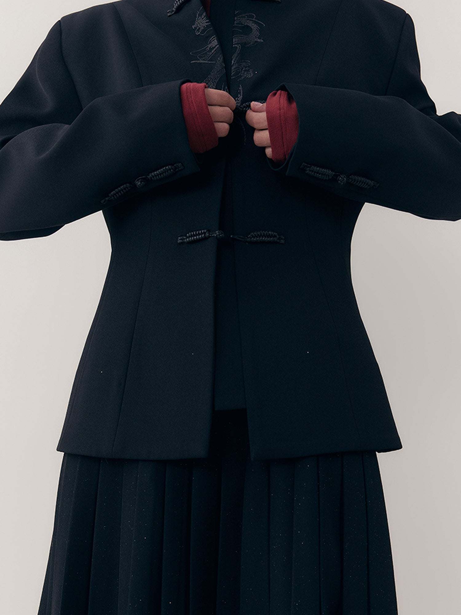 High-quality micro-luster twill suit fabric: 82% polyester, 17% viscose, 1% spandex; lining 100% polyester. Features include two-tone silk-like dragon embroidery, modified Chinese-style silhouette with slightly widened shoulders and waist shaping, Chinese stand collar, and handmade wheat-ear style frog buttons using slightly glossy wax cord. Fabric is firm, dense, with added glitter finish for subtle sheen.