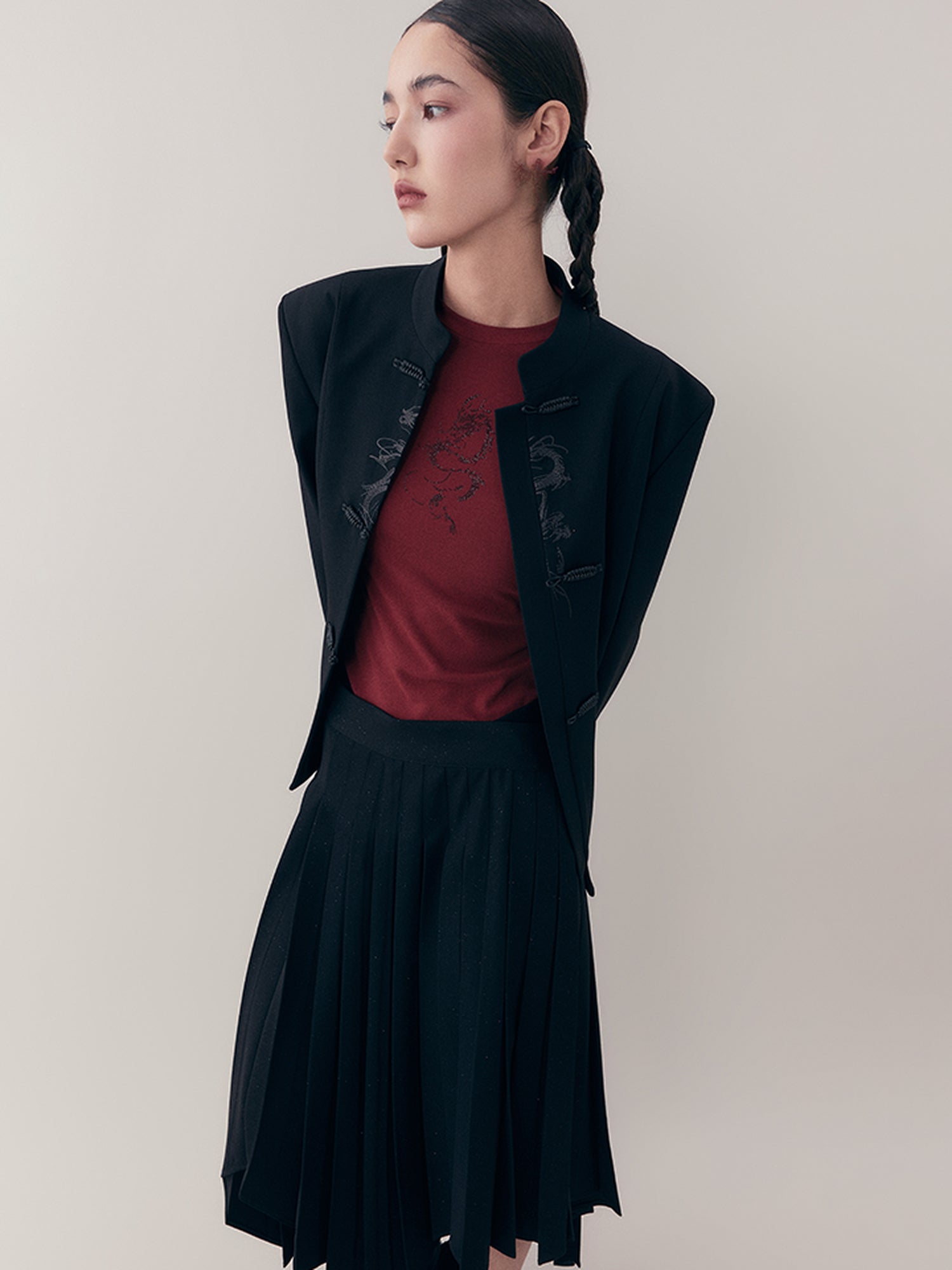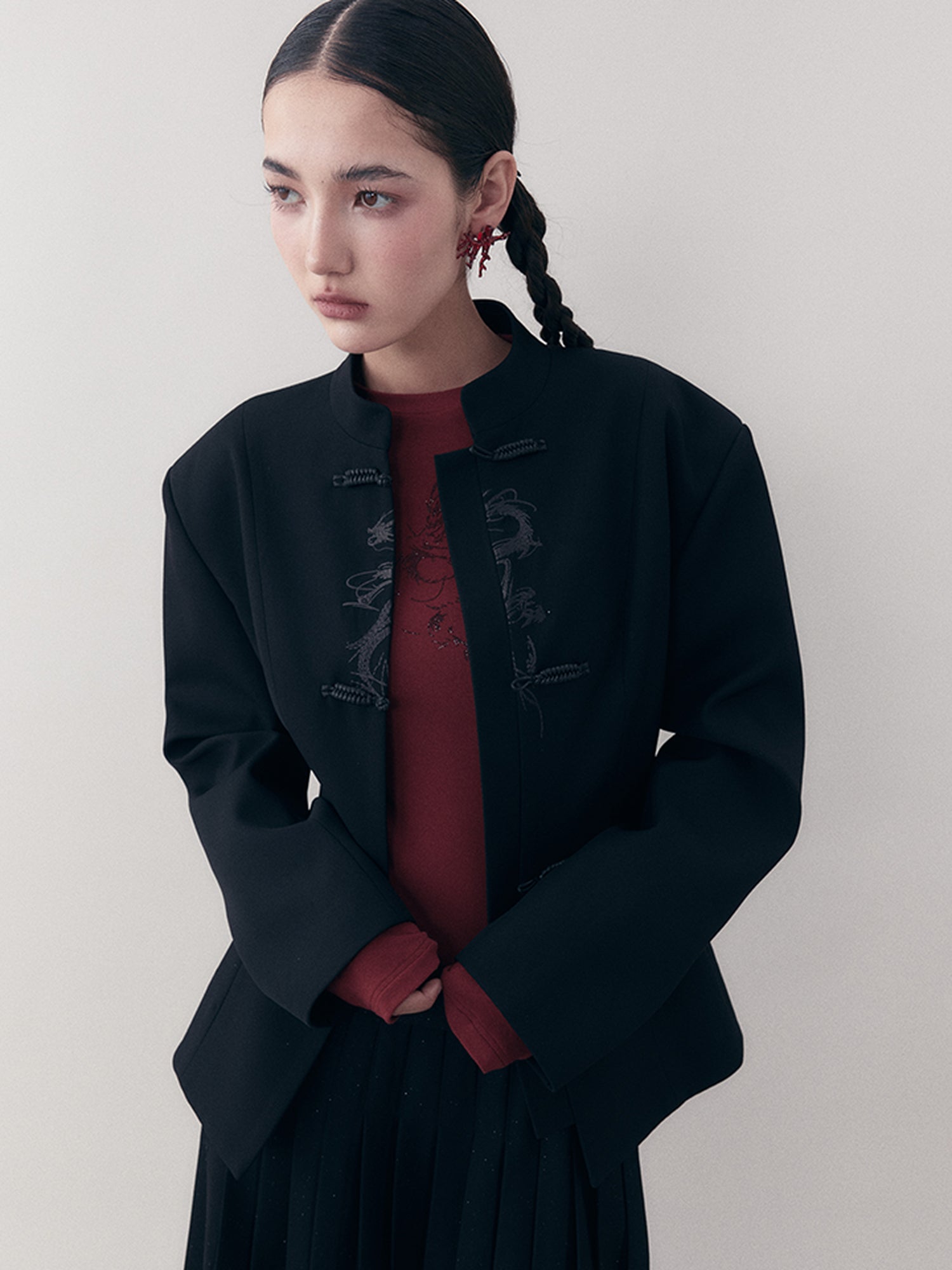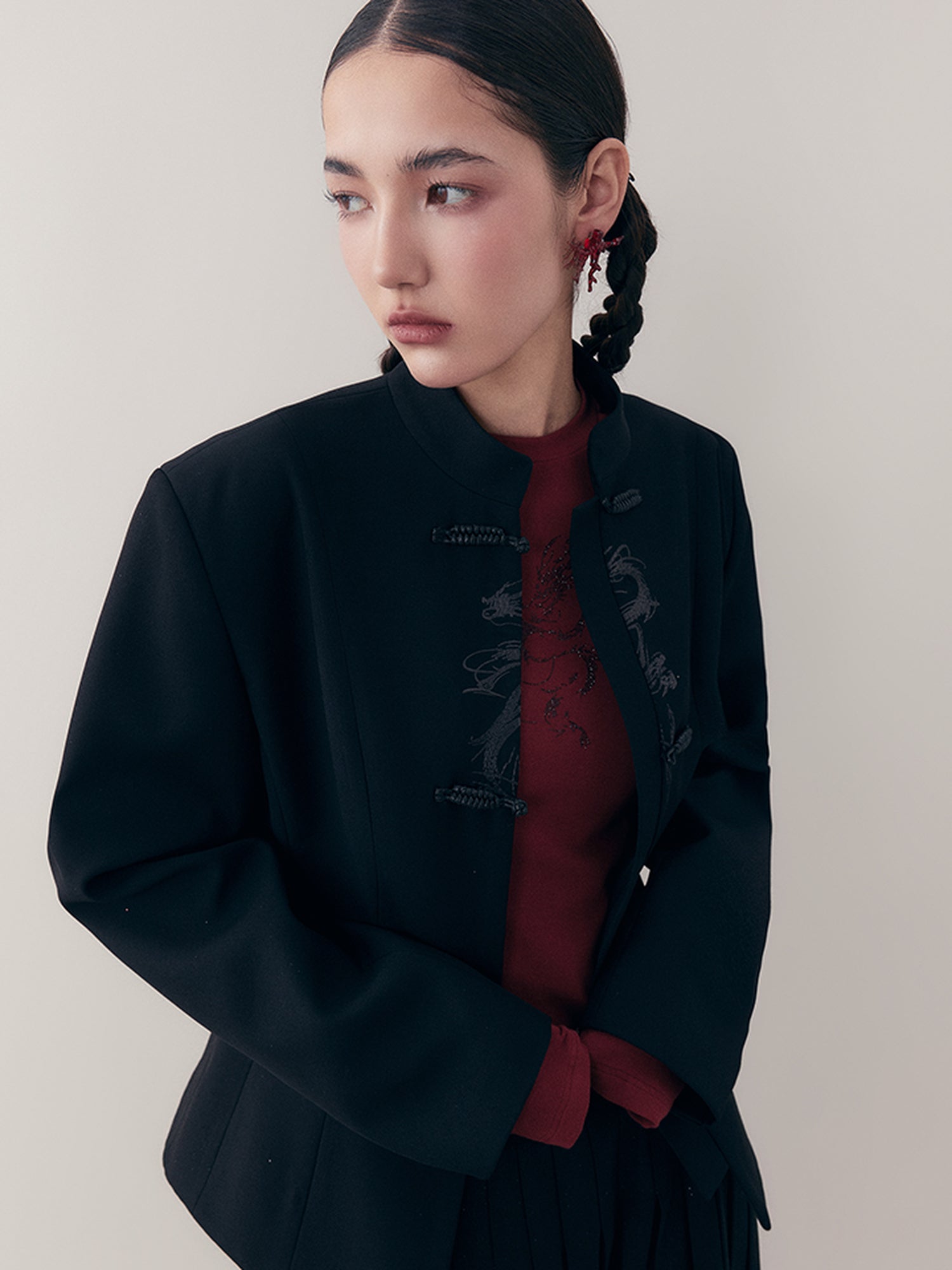 High-quality micro-luster twill suit fabric: 82% polyester, 17% viscose, 1% spandex; lining 100% polyester. Features include two-tone silk-like dragon embroidery, modified Chinese-style silhouette with slightly widened shoulders and waist shaping, Chinese stand collar, and handmade wheat-ear style frog buttons using slightly glossy wax cord. Fabric is firm, dense, with added glitter finish for subtle sheen.