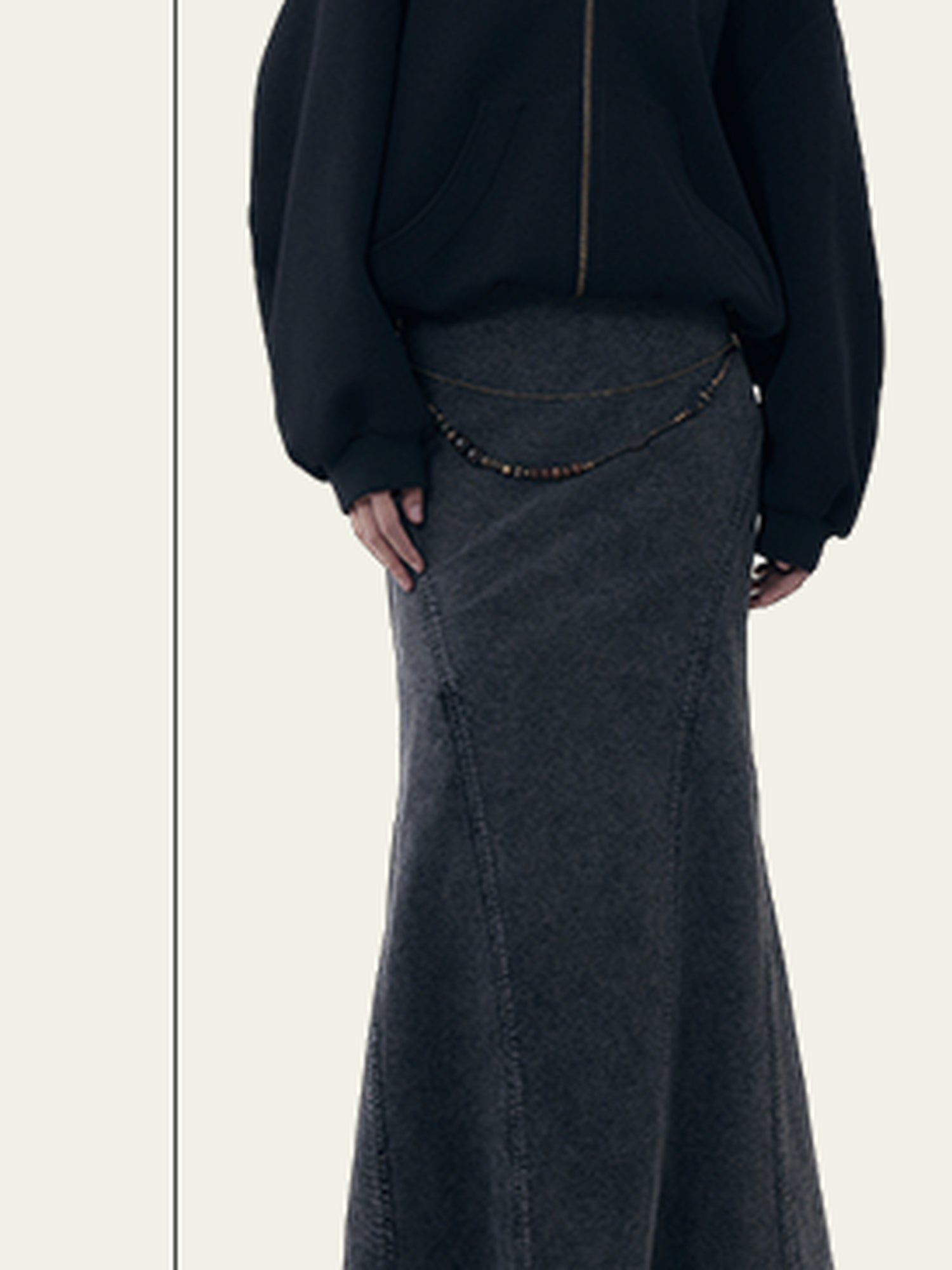 Imitation denim style knitted fabric: The fabric is a blend of 94% cotton and 6% spandex, with good resilience and texture. The design features include a mid low waist fishtail pattern (short in the front and long in the back), a bead waist chain (various wooden beads+metal chains, detachable), a stir fried bone position formed by multiple washings, and a three-dimensional effect of double stitching.