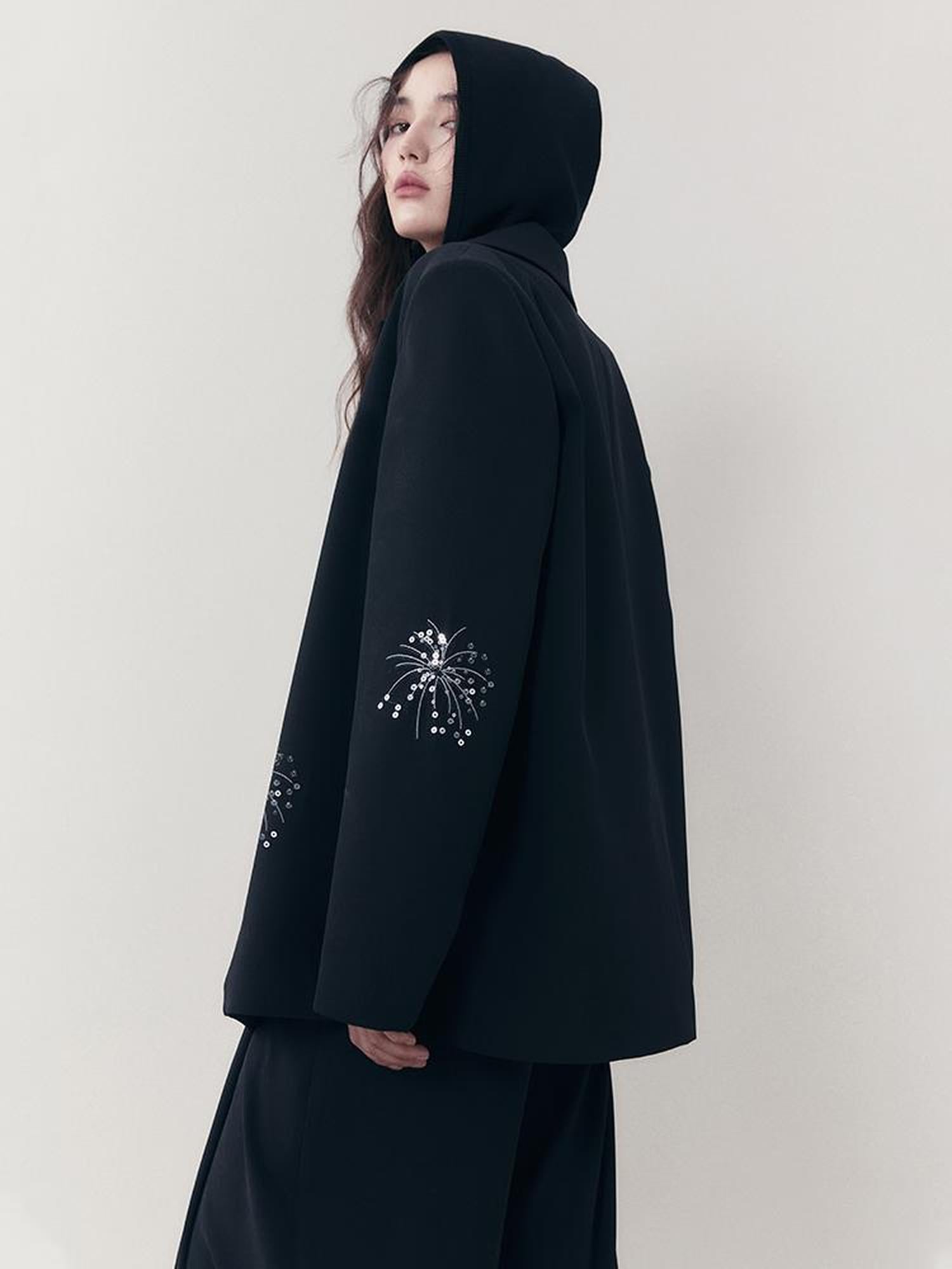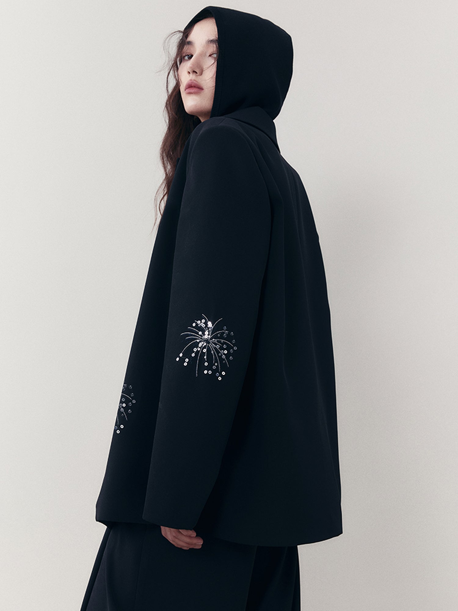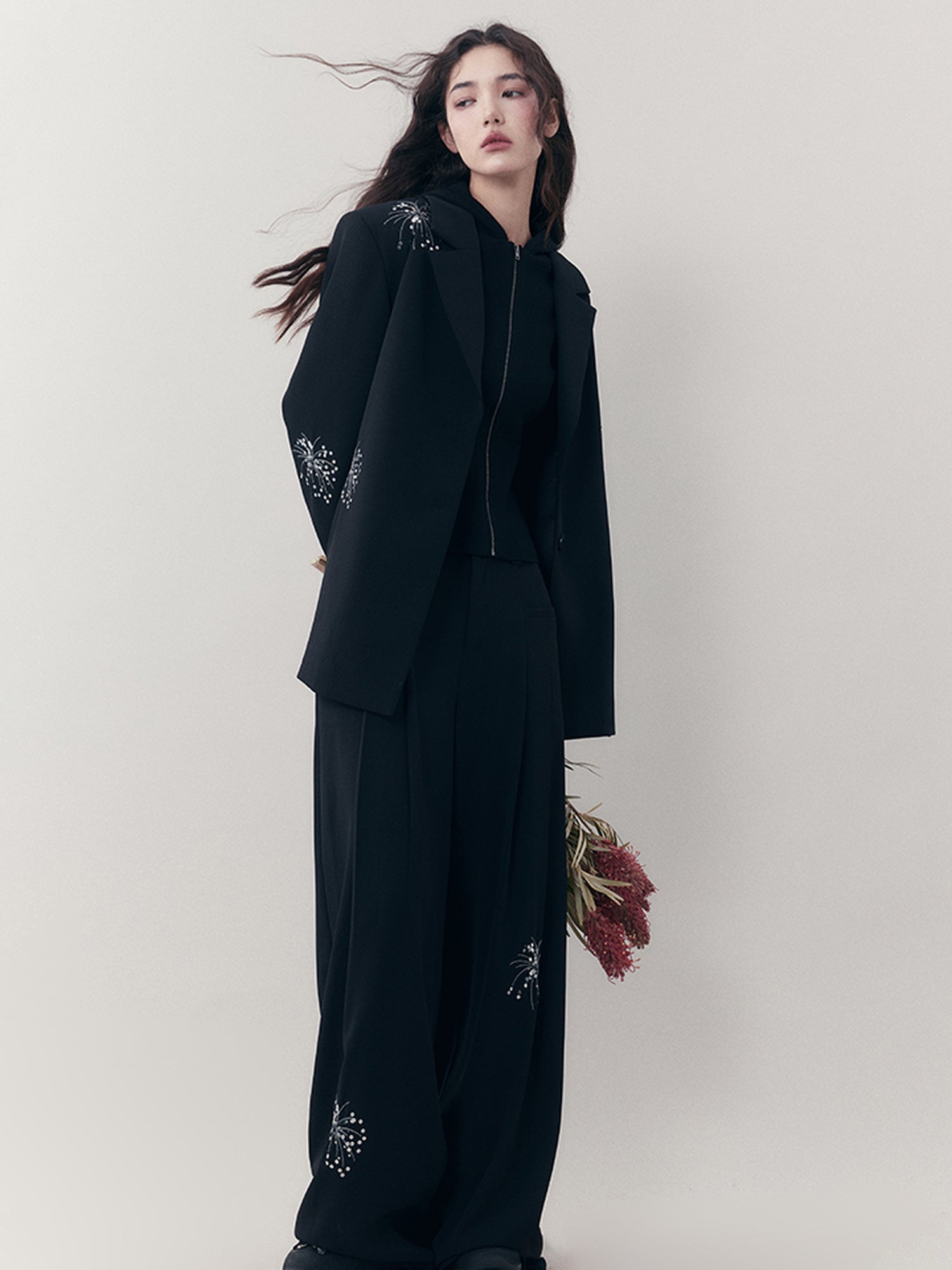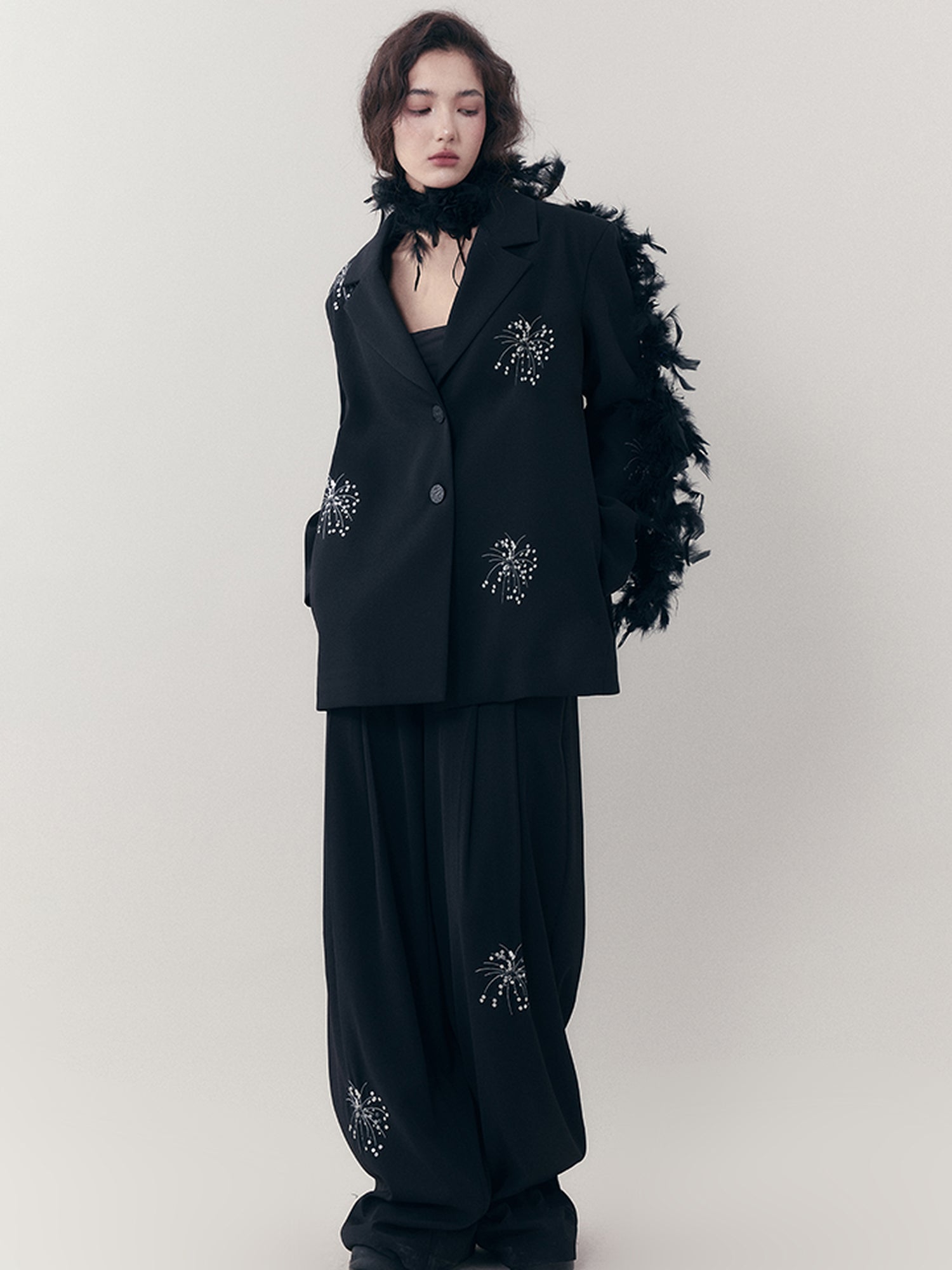 Inspired by festive fireworks and traditional Chinese celebratory motifs. Structured H-shape loose blazer with heavy embroidered/firework sequins details and matching wide-leg trousers with pleats and practical pockets. Main fabric and lining: 100% polyester (sequins excluded).