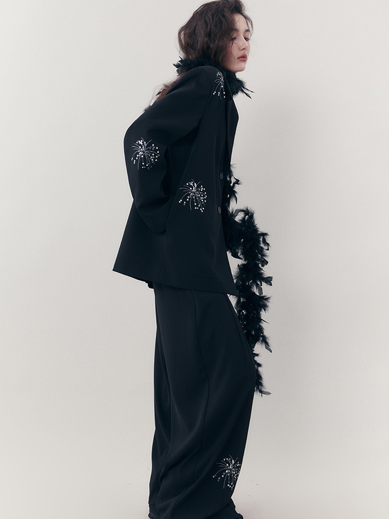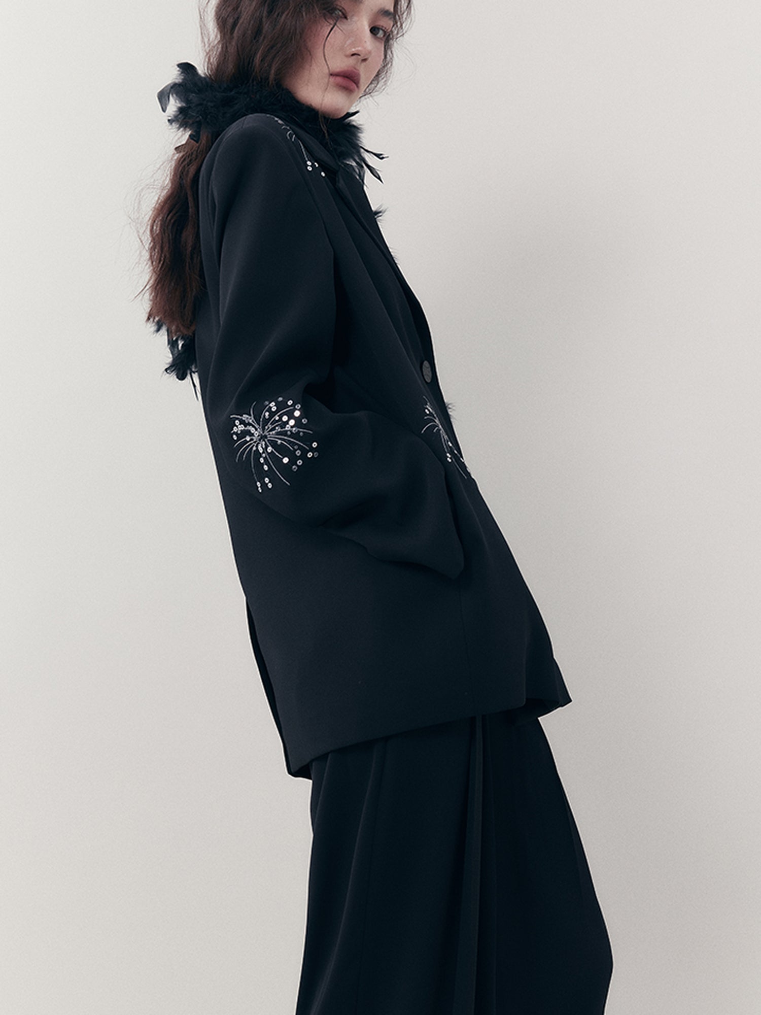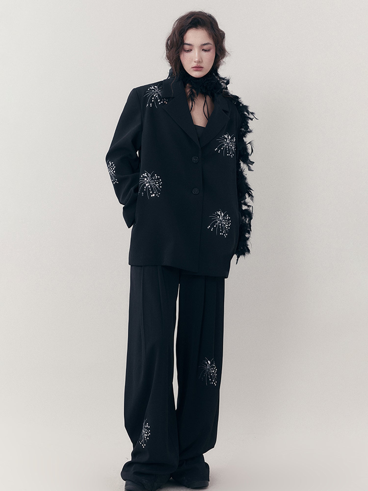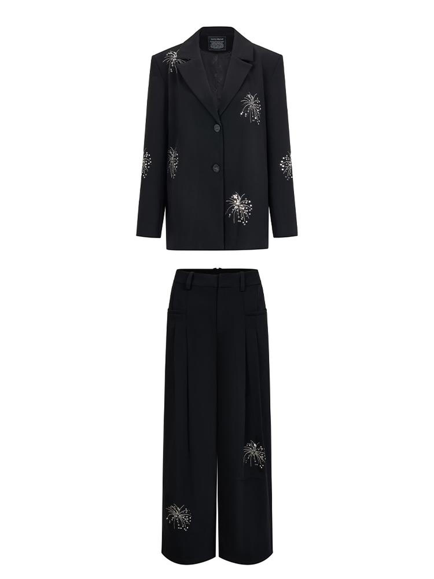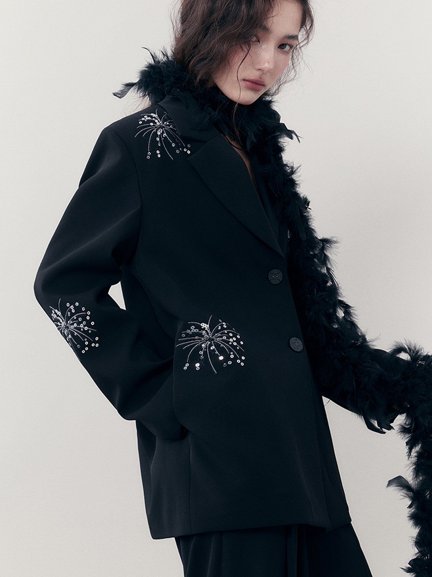 Inspired by festive fireworks and traditional Chinese celebratory motifs. Structured H-shape loose blazer with heavy embroidered/firework sequins details and matching wide-leg trousers with pleats and practical pockets. Main fabric and lining: 100% polyester (sequins excluded).