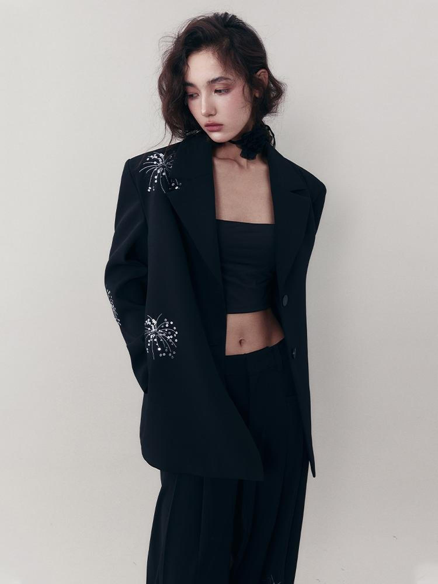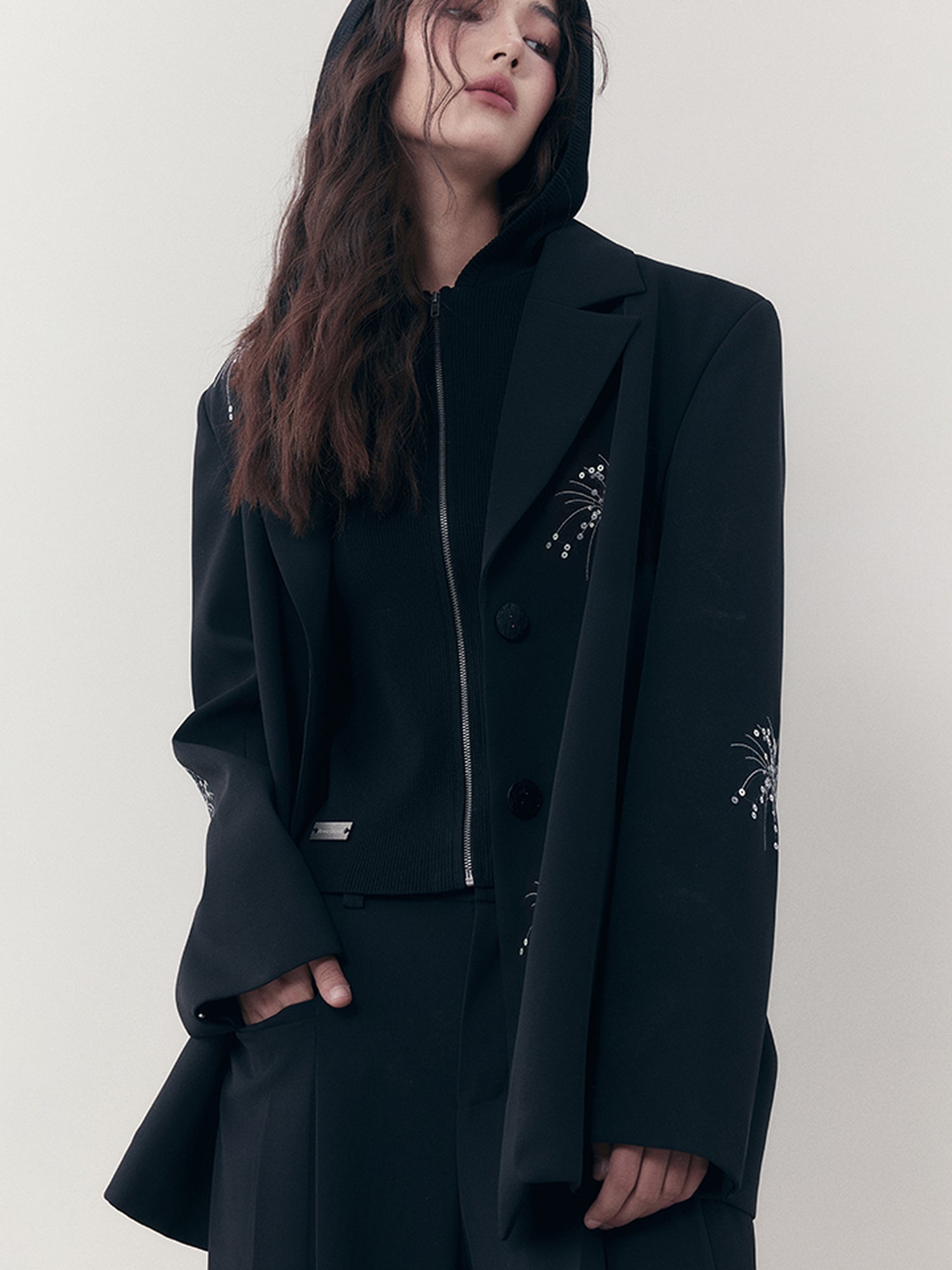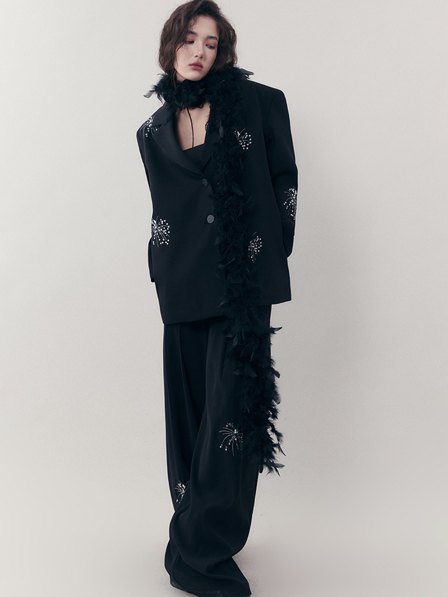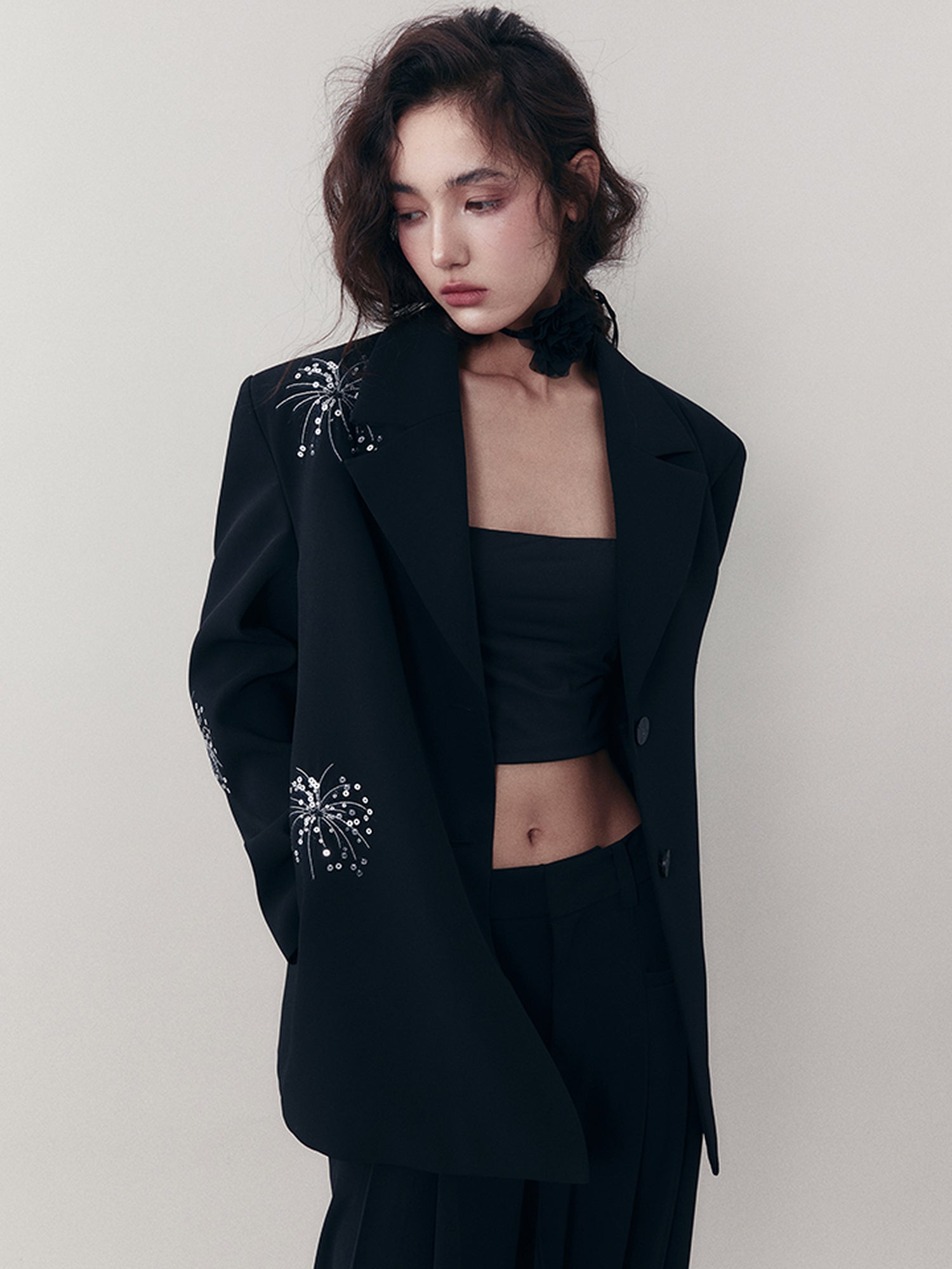 Inspired by festive fireworks and traditional Chinese celebratory motifs. Structured H-shape loose blazer with heavy embroidered/firework sequins details and matching wide-leg trousers with pleats and practical pockets. Main fabric and lining: 100% polyester (sequins excluded).