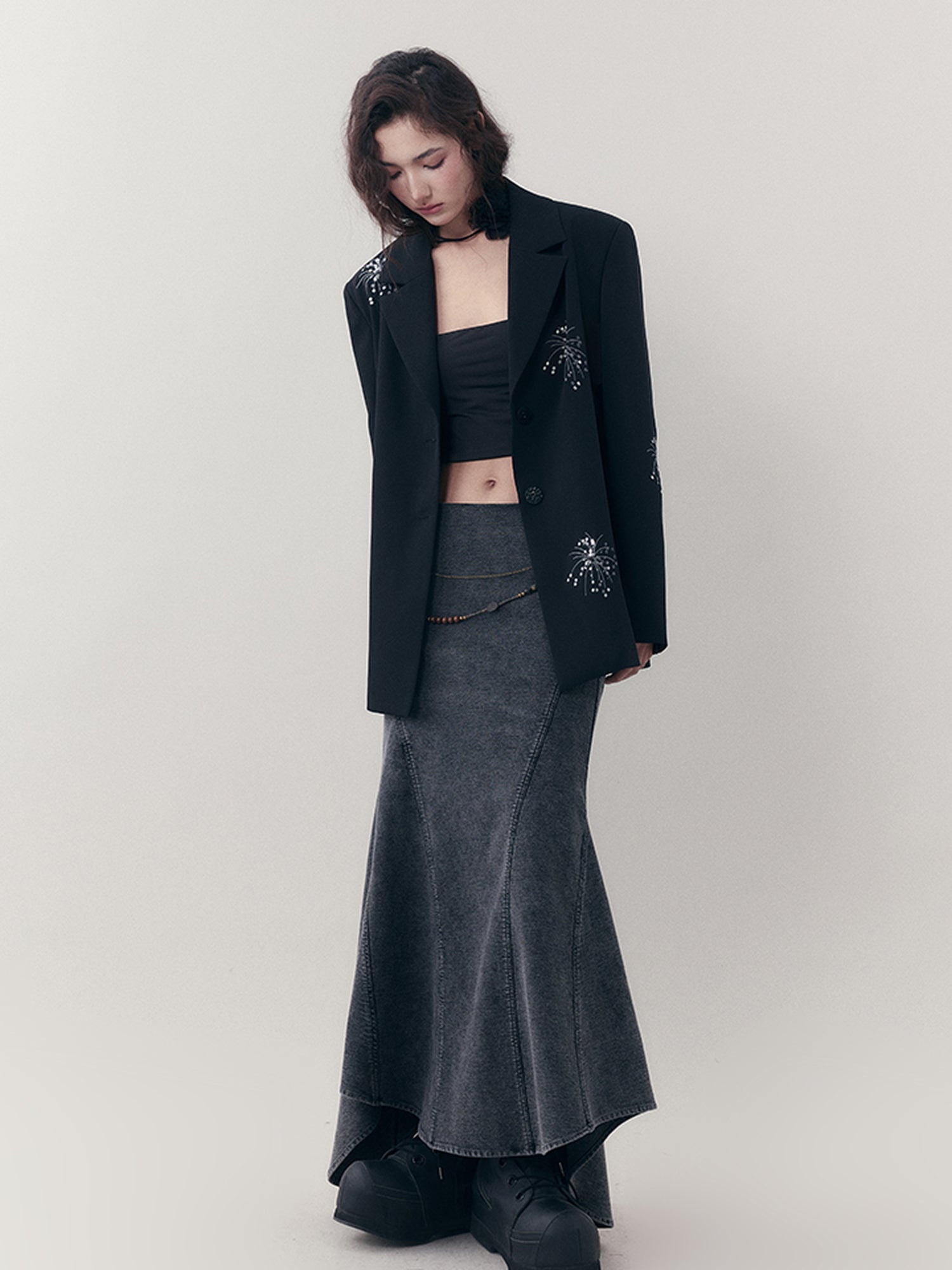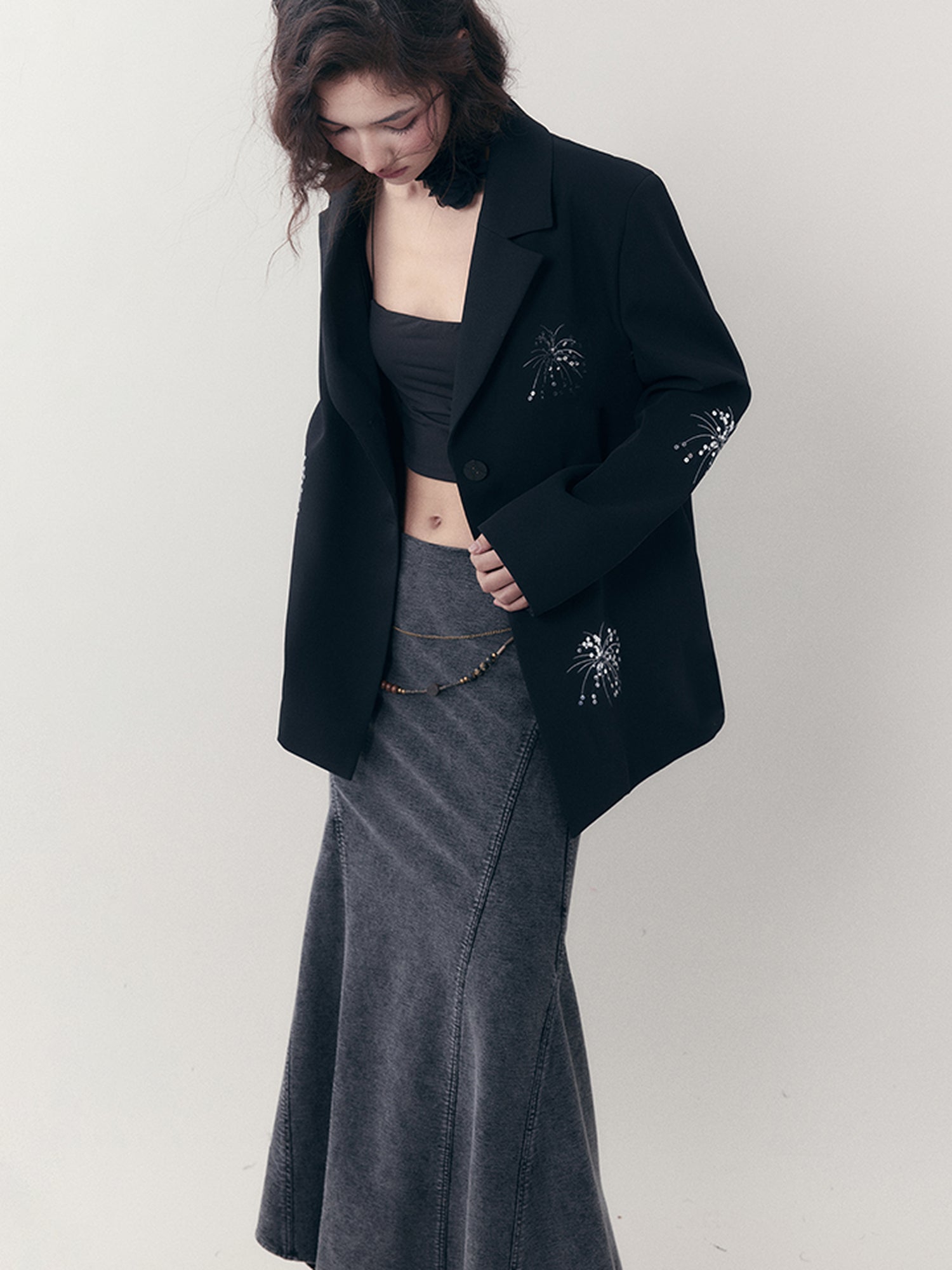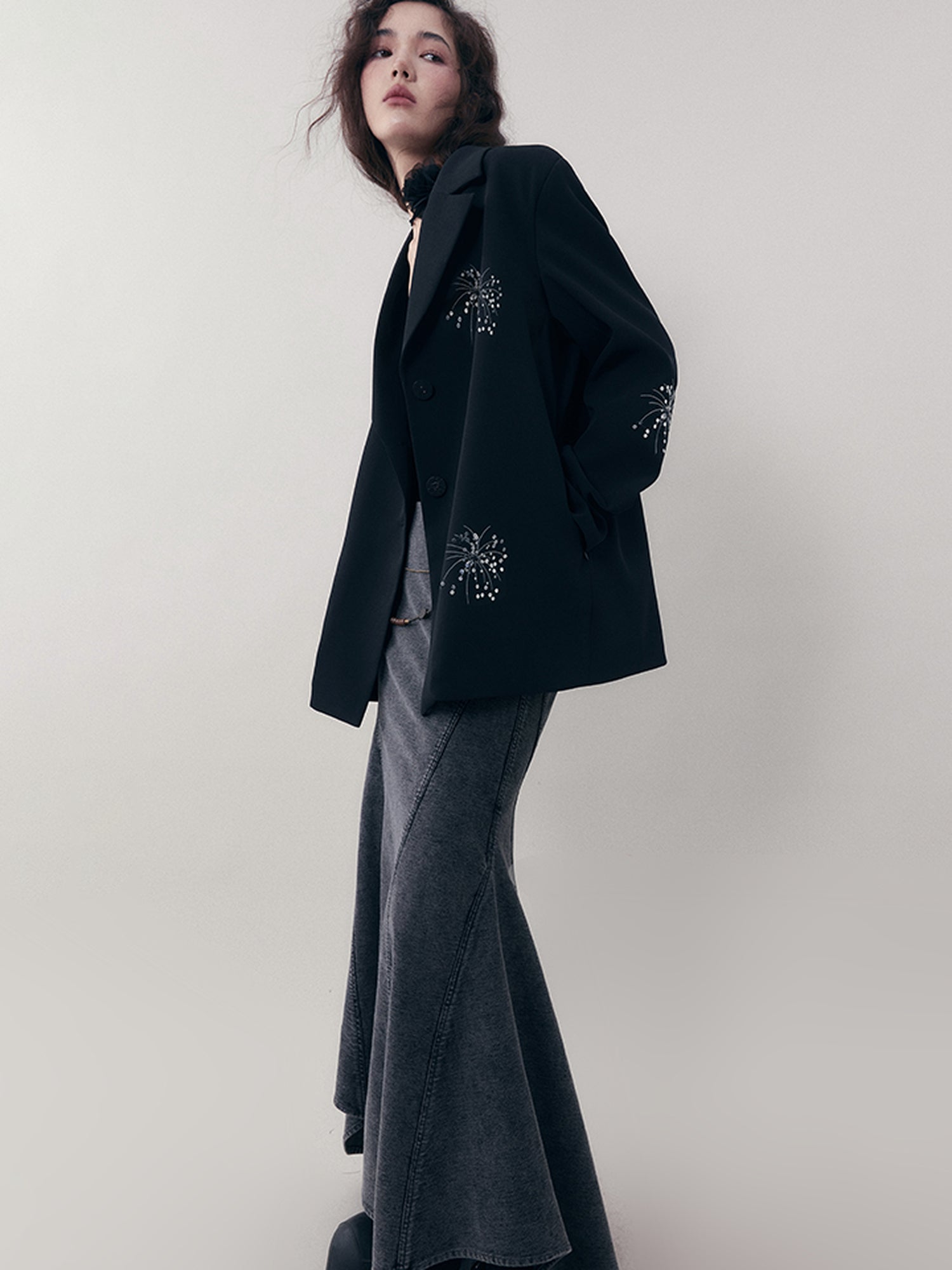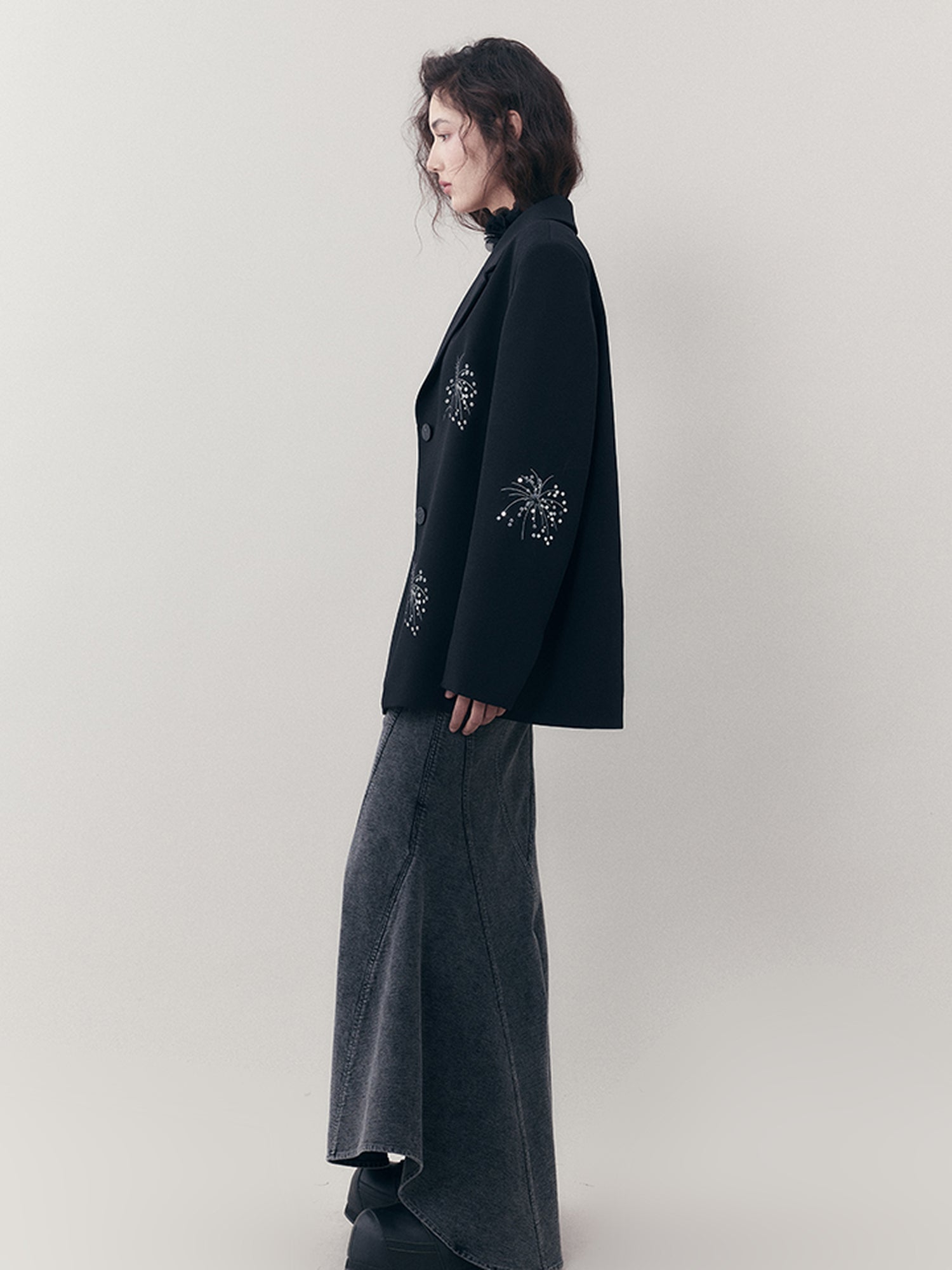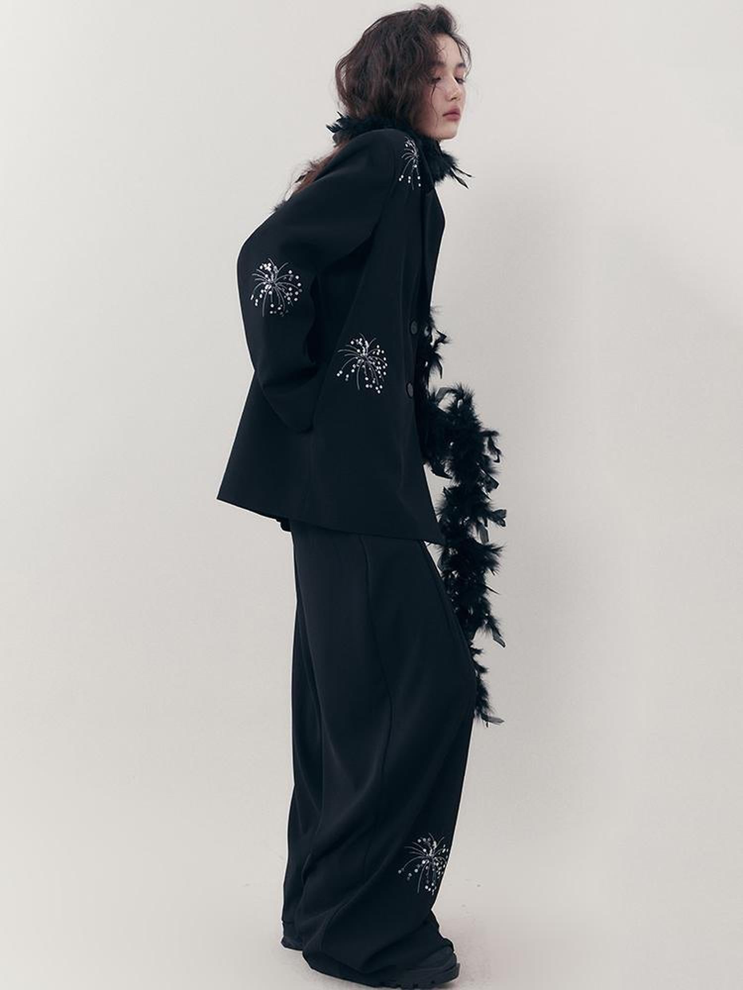 Inspired by festive fireworks and traditional Chinese celebratory motifs. Structured H-shape loose blazer with heavy embroidered/firework sequins details and matching wide-leg trousers with pleats and practical pockets. Main fabric and lining: 100% polyester (sequins excluded).