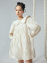 Lotus leaf edge doll collar small floral jacquard dress. A-version dress, beige jacquard fabric, fluffy skirt; Doll collar with flip over tie and ruffled edges, cow tendon closure with bubble sleeves; Segmented cutting to enhance body shape; Short sleeved version, hidden zipper at the back, with a lining that is not transparent.