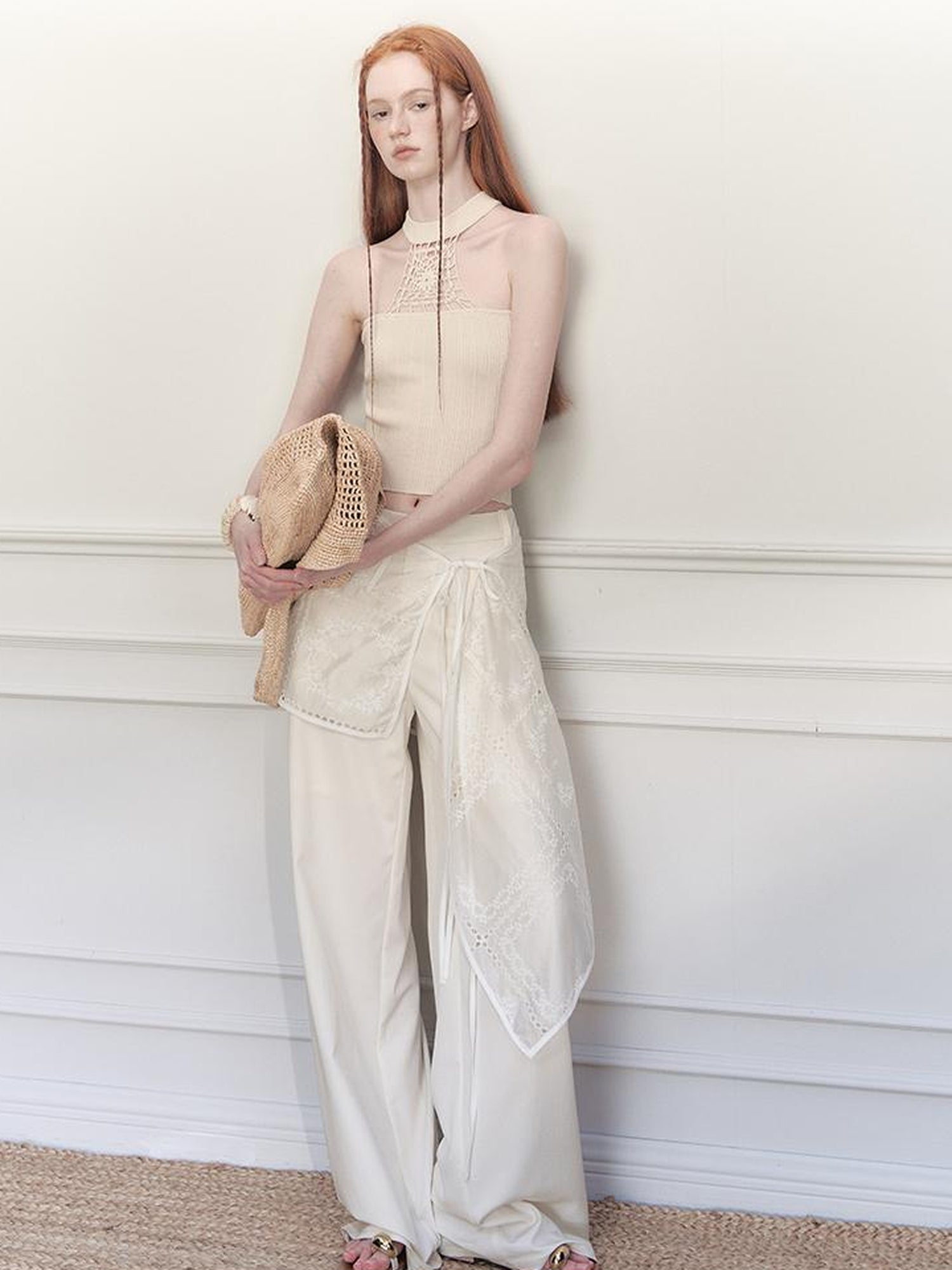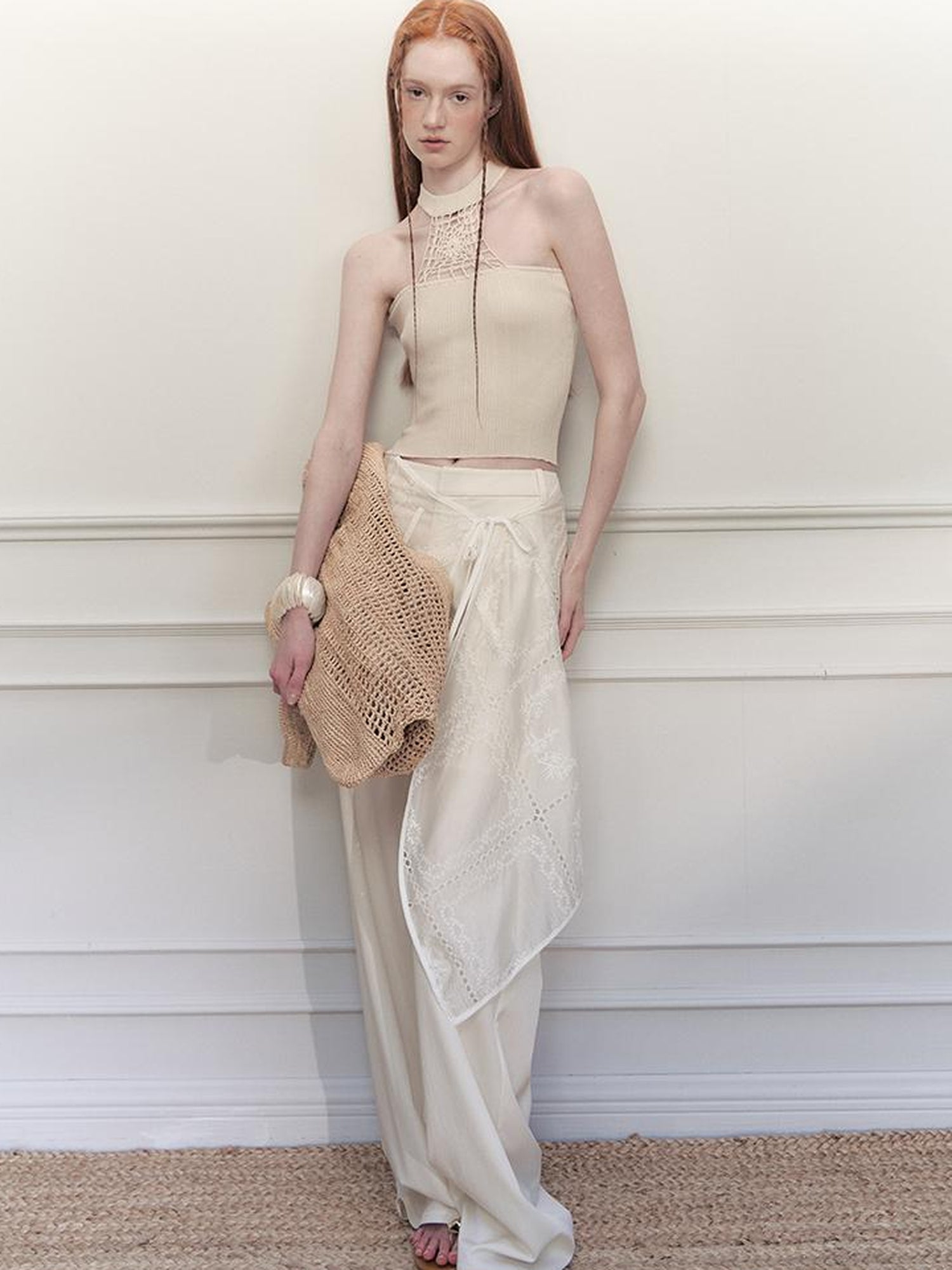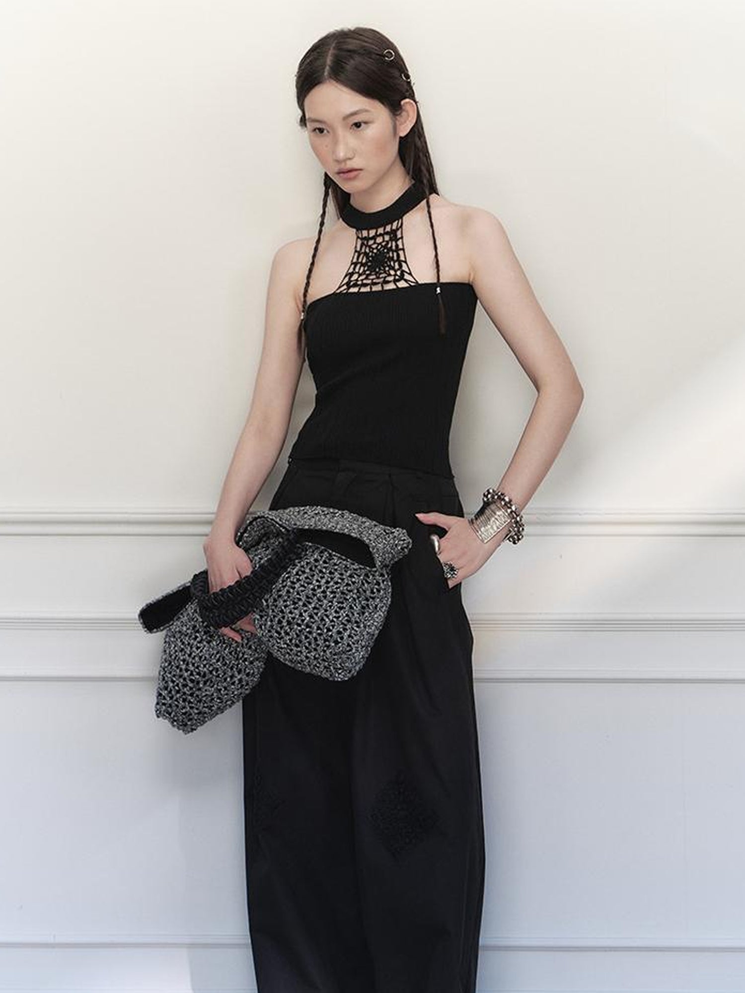 Crochet hanging neck vest, made of blended linen yarn ratio (58% acrylic/27% viscose/15% linen), with wear-resistant, breathable fabric and silky feel. The design highlights include handmade crochet neckline, round neck hanging neck design, and a fitted vest silhouette, which combines decoration and conforms to the lines. It can be worn alone or as an inner layer in summer.