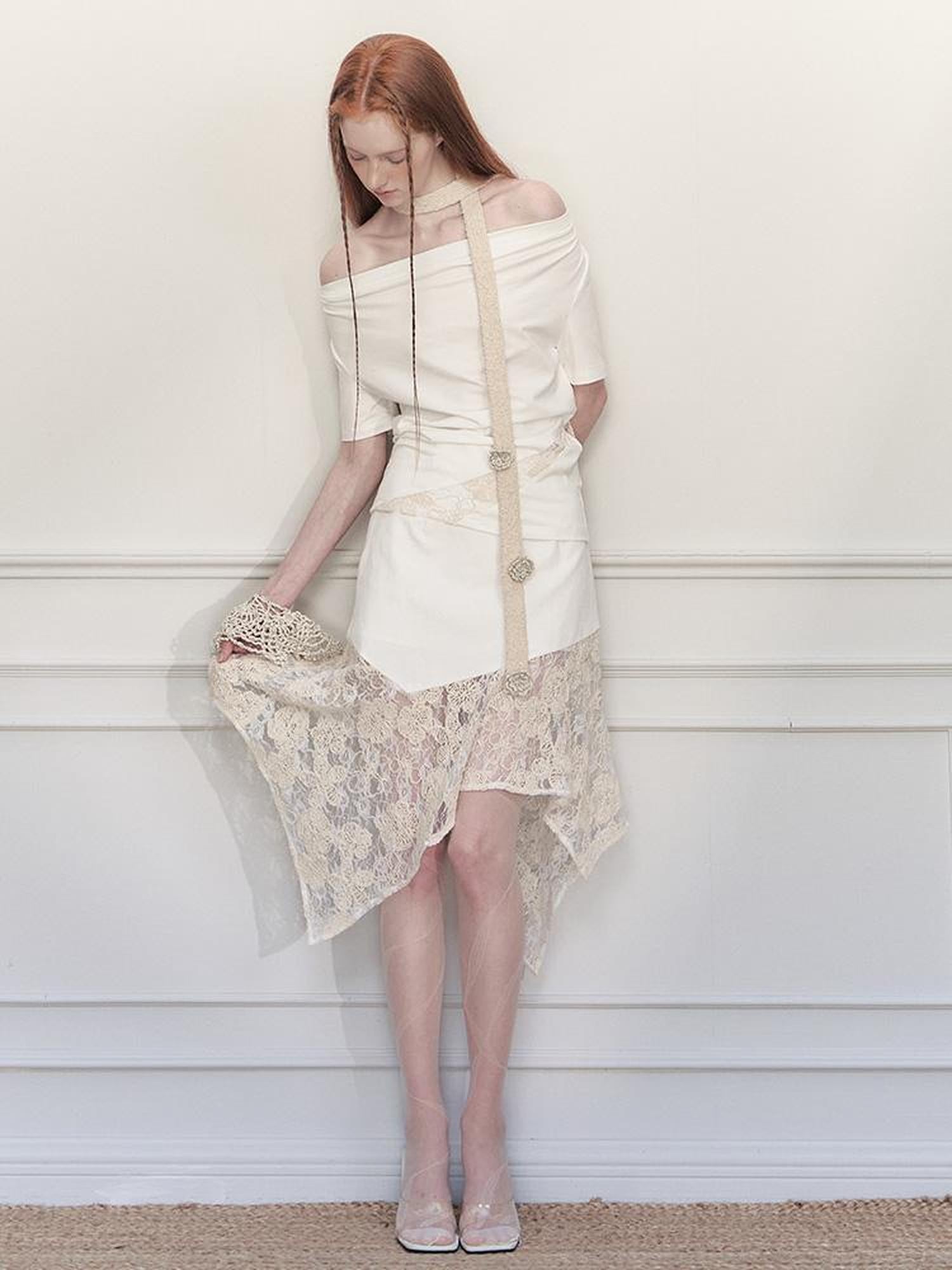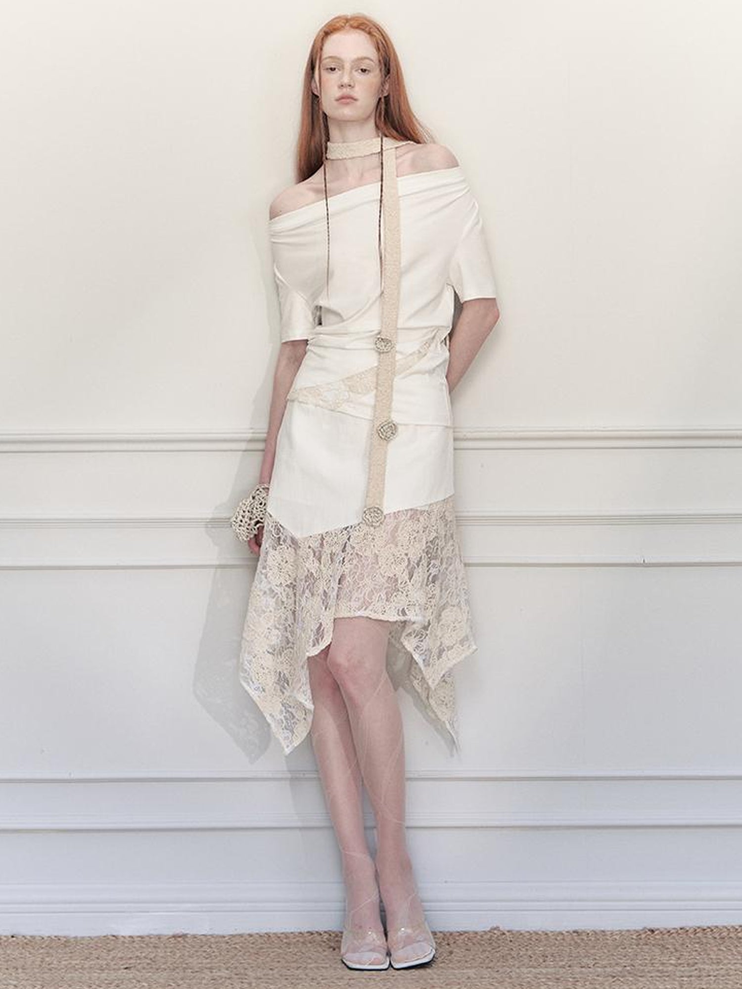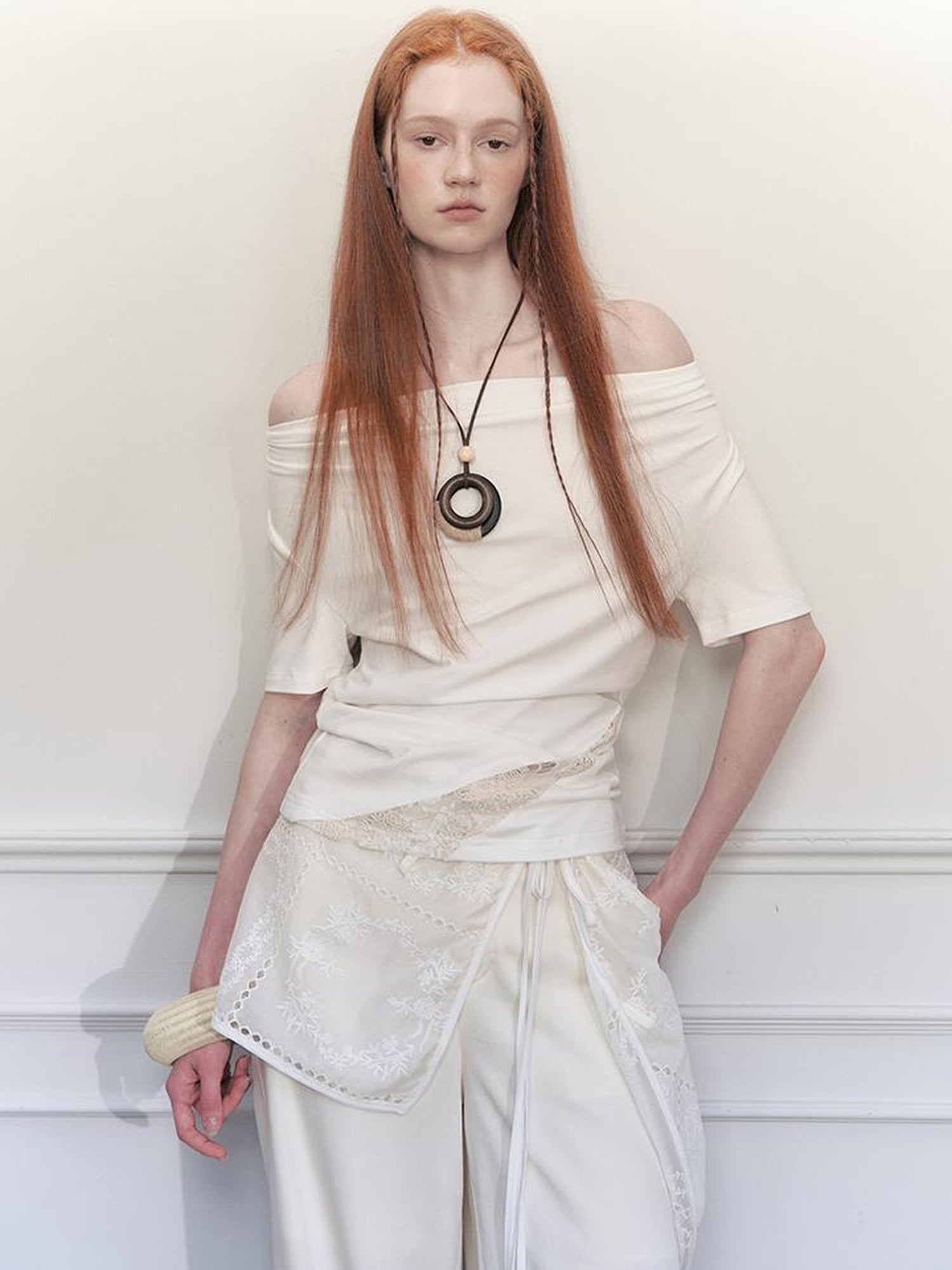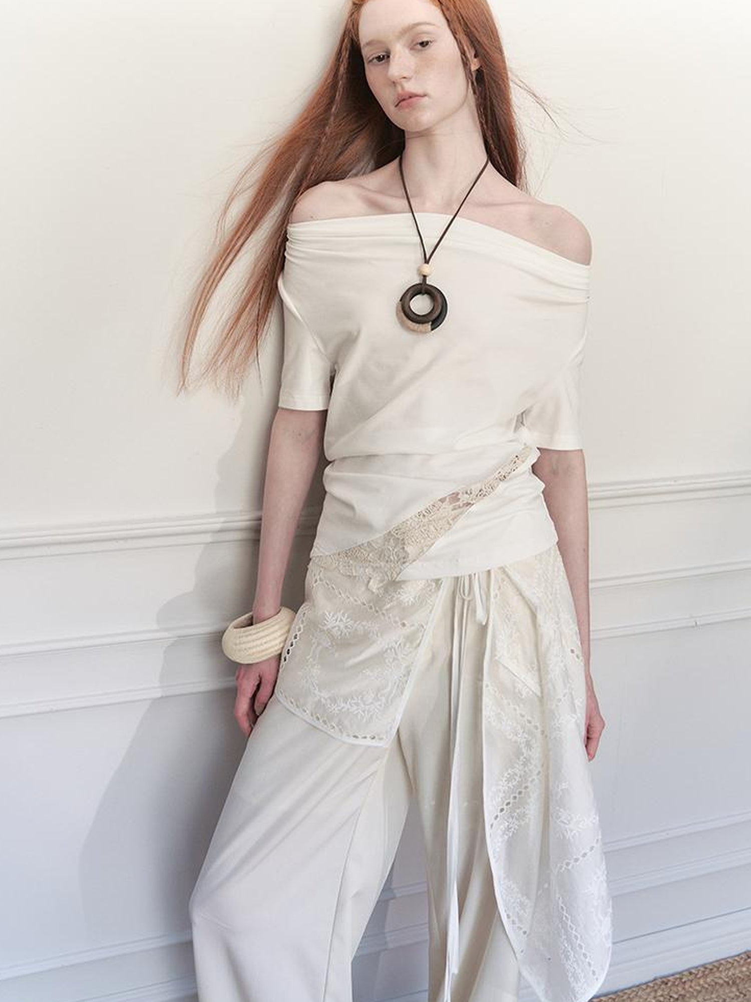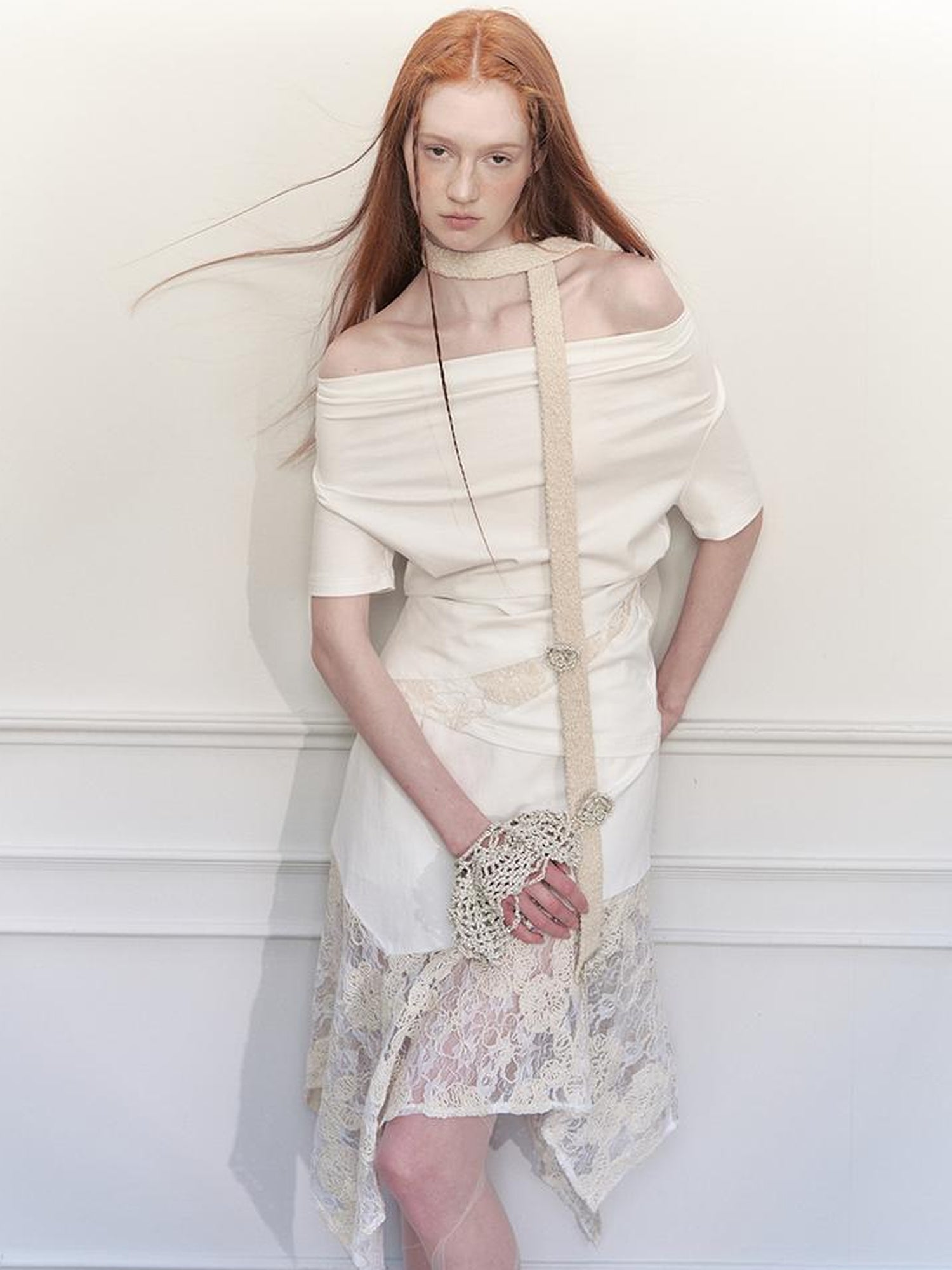 High quality Peruvian cotton knitted fabric; 3D rope embroidered lace fabric. Fabric A: 92% cotton and 8% spandex. Fabric B: The top layer is 100% polyester fiber, and the bottom layer is 100% nylon. Due to the impact of raw material supply, there may be slight fluctuations in the fabric composition of different batches of products. The actual composition is subject to the physical tag. Selected high-quality imported yarn, tightly spun process, treated with etching process, the fabric surface feels soft, skin friendly and breathable; Lace as the base, hollowed out and breathable, with delicate and durable rope embroidery craftsmanship. Product features: Unique off shoulder design (one piece, three pieces: one shoulder, slanted shoulder, swing collar), combined silhouette and small short sleeved design, lace stitching at the hem to enhance texture and layering.