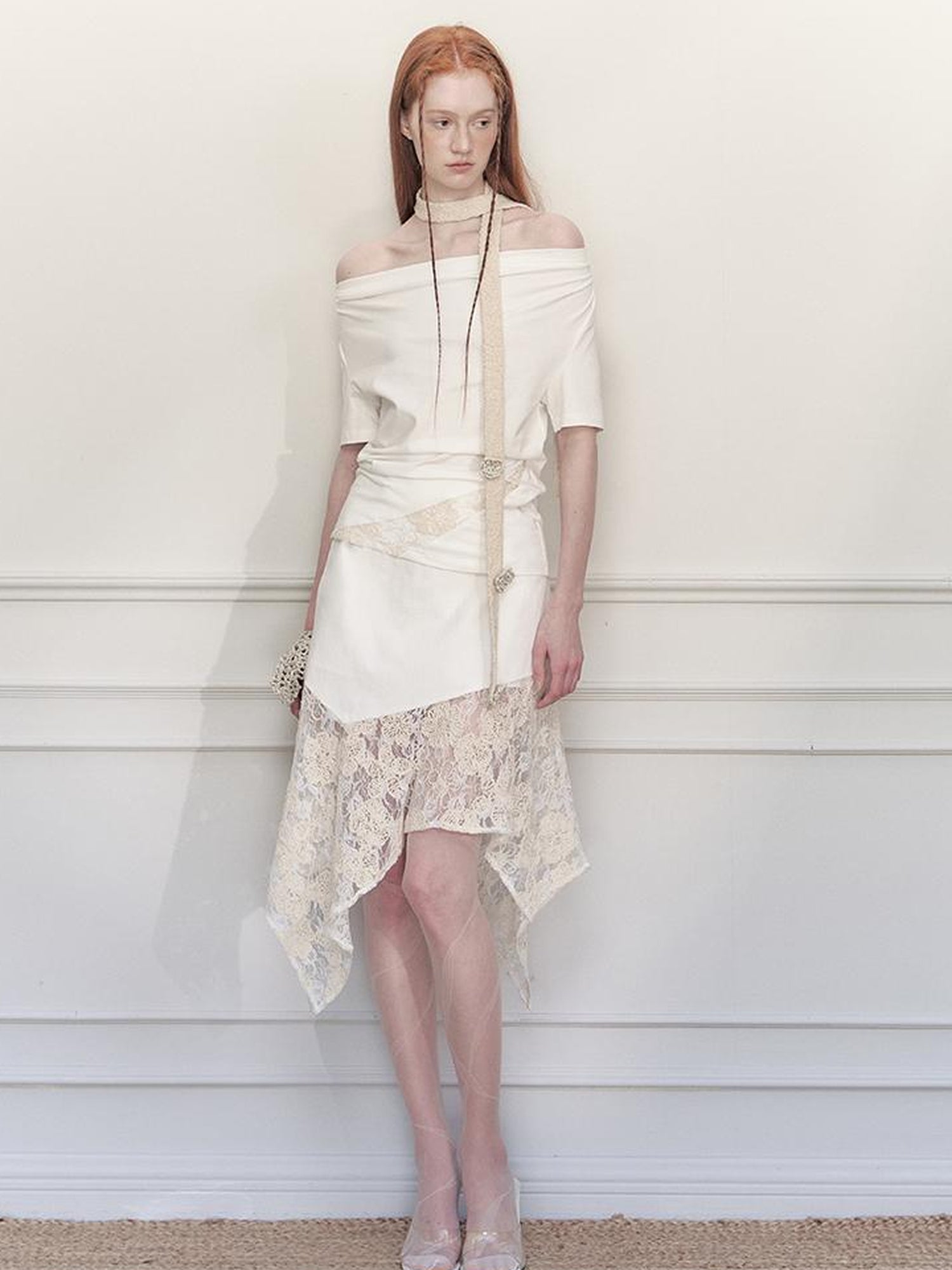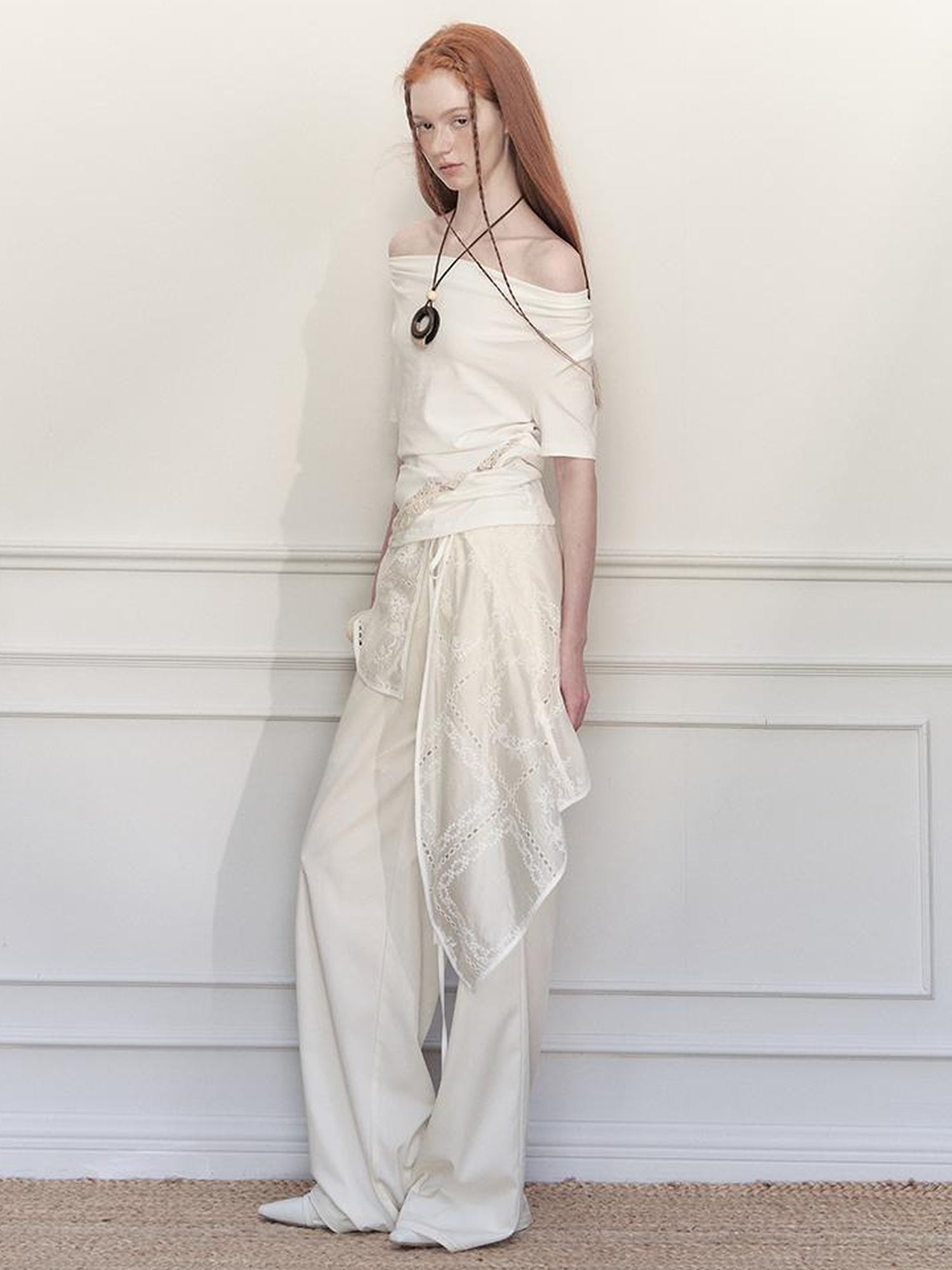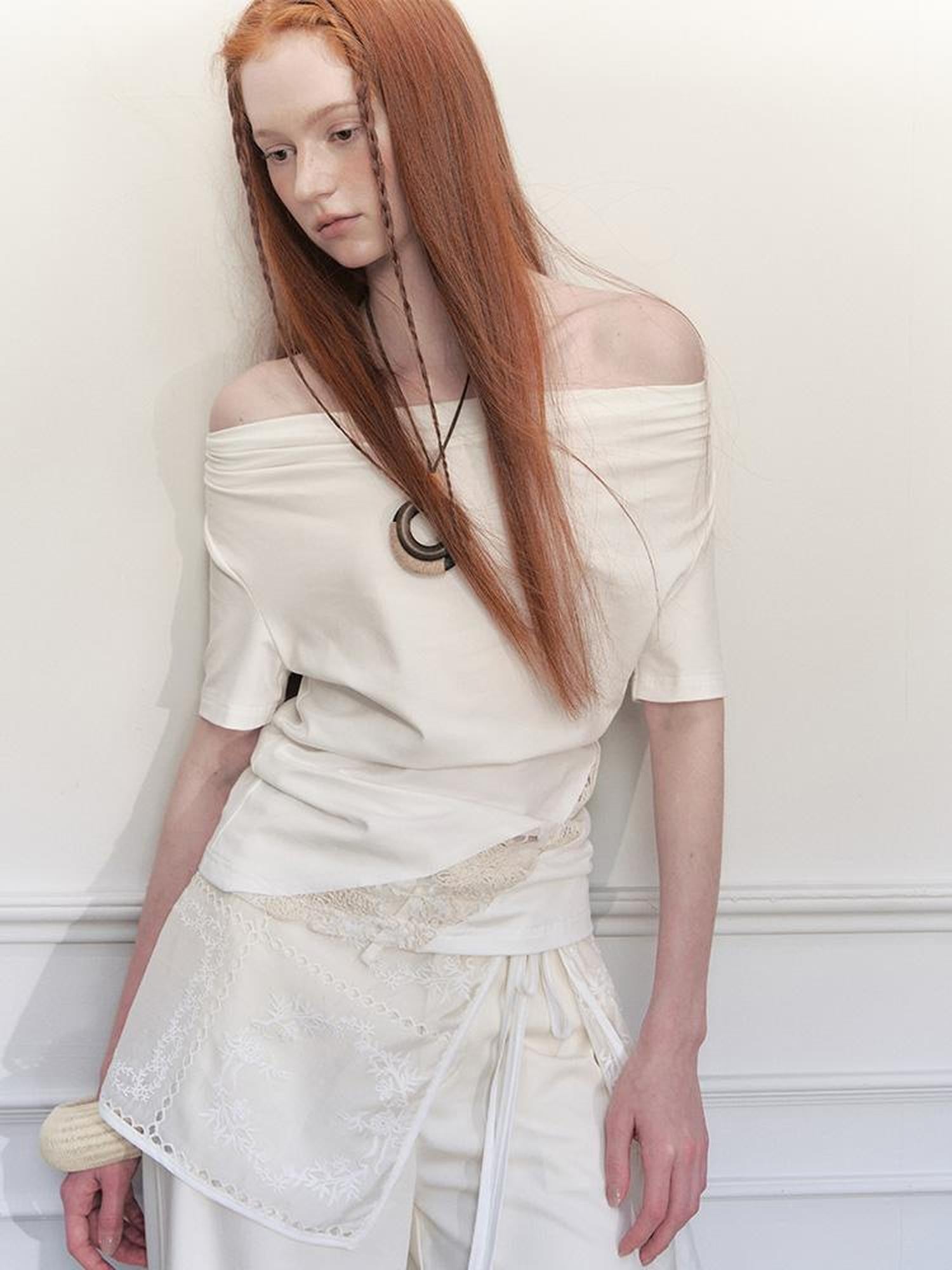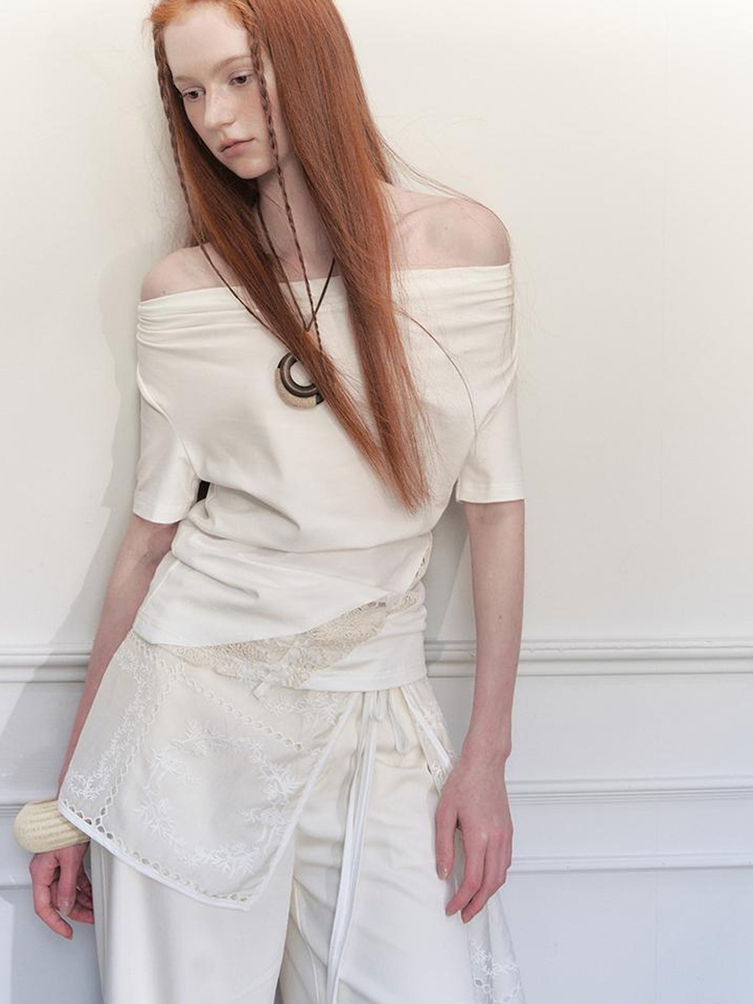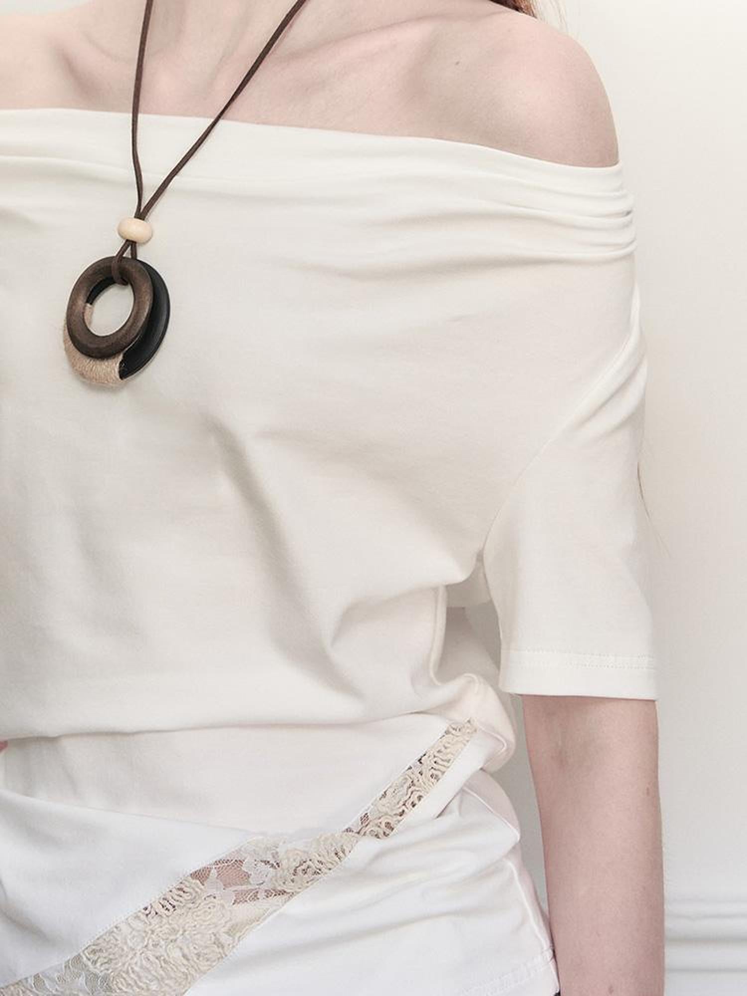 High quality Peruvian cotton knitted fabric; 3D rope embroidered lace fabric. Fabric A: 92% cotton and 8% spandex. Fabric B: The top layer is 100% polyester fiber, and the bottom layer is 100% nylon. Due to the impact of raw material supply, there may be slight fluctuations in the fabric composition of different batches of products. The actual composition is subject to the physical tag. Selected high-quality imported yarn, tightly spun process, treated with etching process, the fabric surface feels soft, skin friendly and breathable; Lace as the base, hollowed out and breathable, with delicate and durable rope embroidery craftsmanship. Product features: Unique off shoulder design (one piece, three pieces: one shoulder, slanted shoulder, swing collar), combined silhouette and small short sleeved design, lace stitching at the hem to enhance texture and layering.