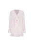 | Classic relaxed shirt silhouette for effortless comfort Asymmetrical ruffled V-neck elongates neckline Gathered cuffs echo the overall design Hem ruffles add refined detailing |