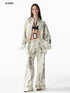 Leopard-print oversized shirt with straight trousers. Shirt: loose silhouette, classic collar, wide foldable cuffs, side ties to cinch waist, chest patch pocket with random leopard placement. Pants: straight-leg with elastic waistband and drawstring, foldable wide leg to adjust length.