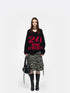 Knitted slogan V-neck long sleeve. One-piece molding; loose fit; high elasticity; knitted print (colorfast, non-shedding). Color: black. Made in China.