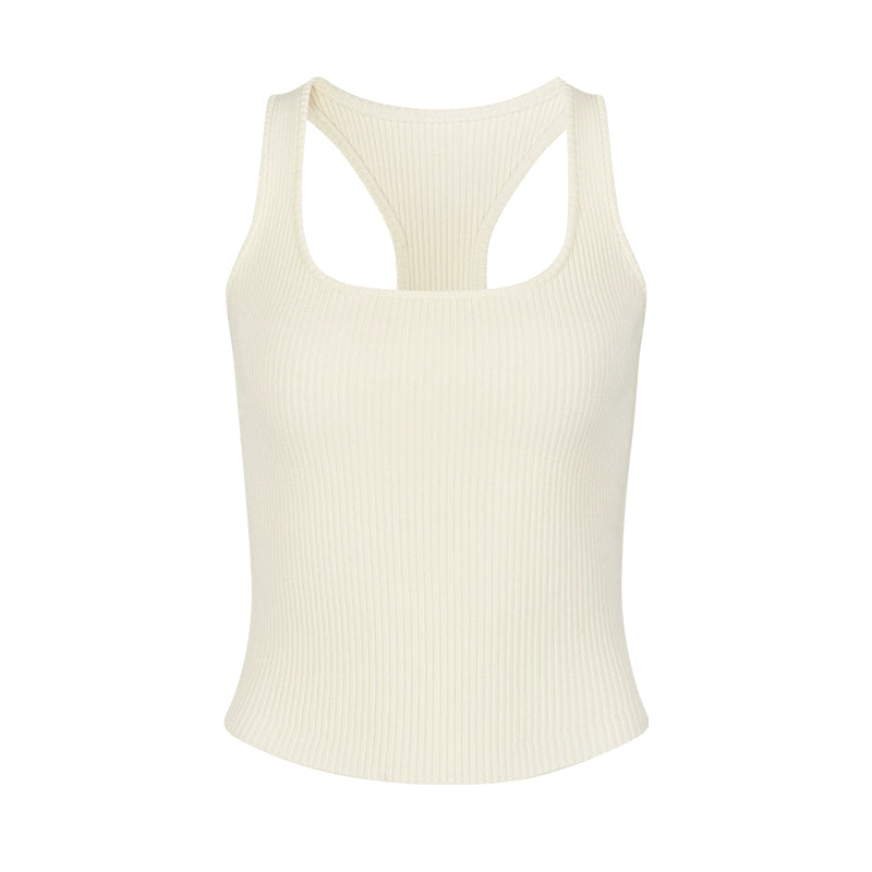 Anti pilling high twist core spun yarn. 75.4% viscose fiber and 24.6% polyester fiber. High twist yarn has a high degree of tightness, good wear resistance, avoids breakage, is more durable, has a soft touch, is comfortable to wear, and has a high-end texture for ready to wear clothing. Pit stripe knitting: Combining dual color yarn with 16 needle high-density pit stripe weaving method, it appears slim in the longitudinal direction, with high elasticity that balances inclusiveness and comfort. Double sided different collar styles and combined designs: The front square collar and back I-shaped vest form a geometric shape, and the micro combined cut balances slim fit and freedom of movement, achieving a dynamic balance between elegance and comfort.