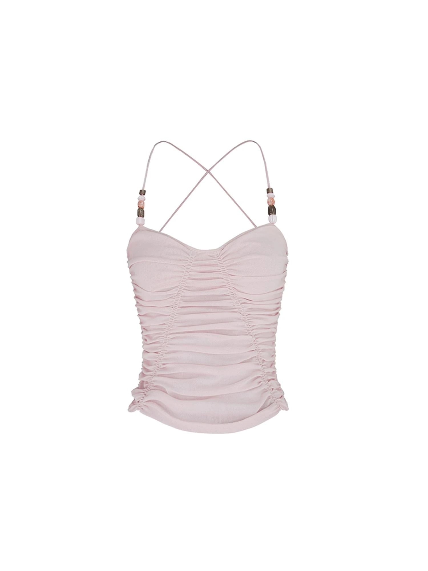 | Striking halter design with elastic mesh fabric; Beaded straps for layered styling; Can be worn alone or layered. |