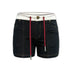 Low waisted slim fit denim shorts, with a main fabric of approximately 93% cotton, 6% polyester fiber, 1% spandex, 3/1 diagonal weave, indigo blue color scheme, gradually fading with wear to form texture. Featuring a contrasting wide waistband and red drawstring design, the waistband is made of approximately 95% cotton and 5% spandex ribbed stitching, which is skin friendly and elastic.