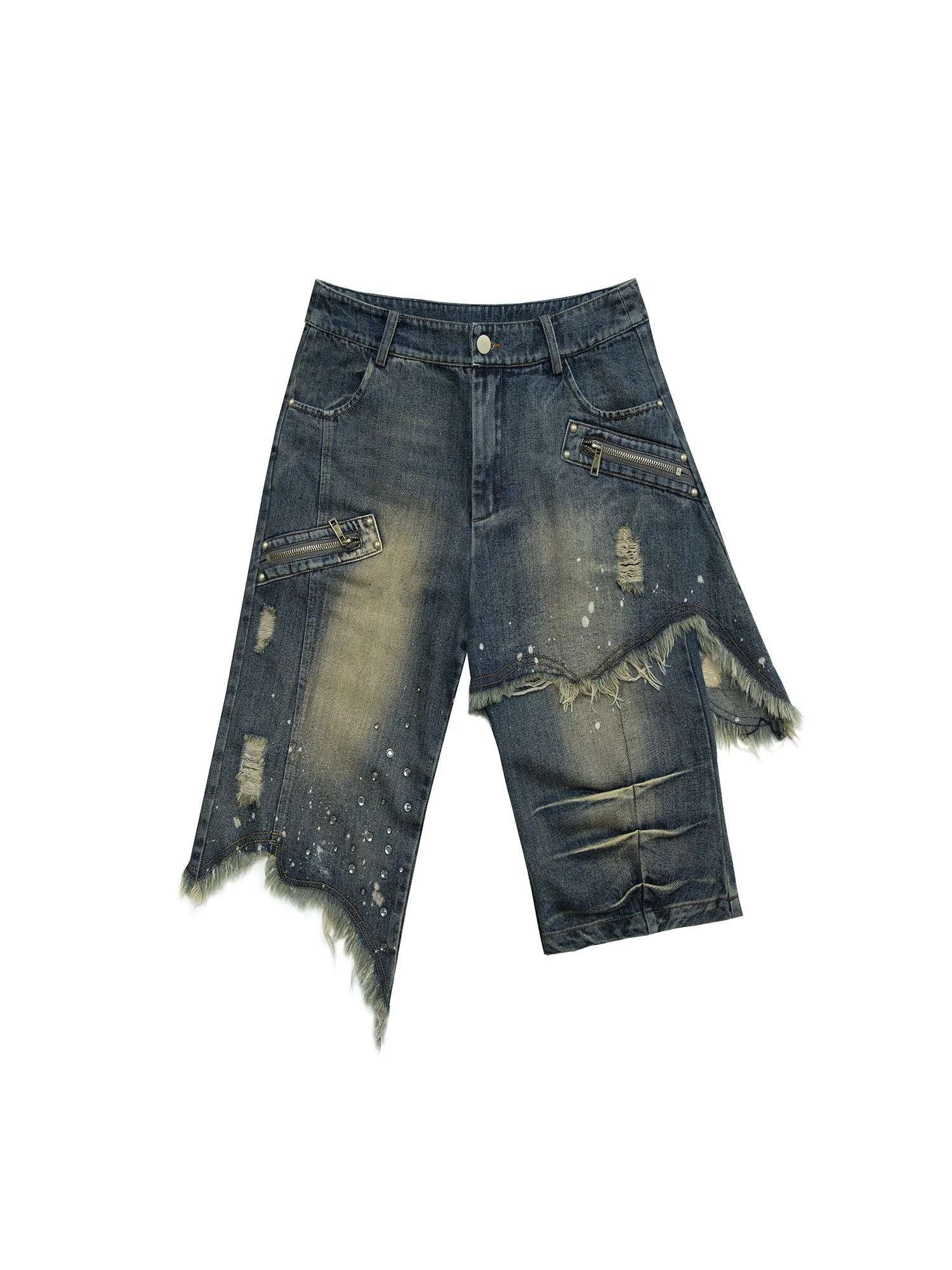 The denim bike girl in the unmanned neighborhood, this season's denim style is cool and loose casual mid pants. Fake two-piece cutting and splitting of rough edges, irregular cutting and washing of rough edges, side decoration of zippers, rivets, hot stamping and other heavy-duty street elements, denim bleaching process polka dot hem decoration. Comfortable and versatile upper body, with a distinct retro feel of wasteland. Fabric composition: 95% cotton and 5% polyester. Pay attention to color differences caused by shooting, lighting, etc., and refer to the actual product.