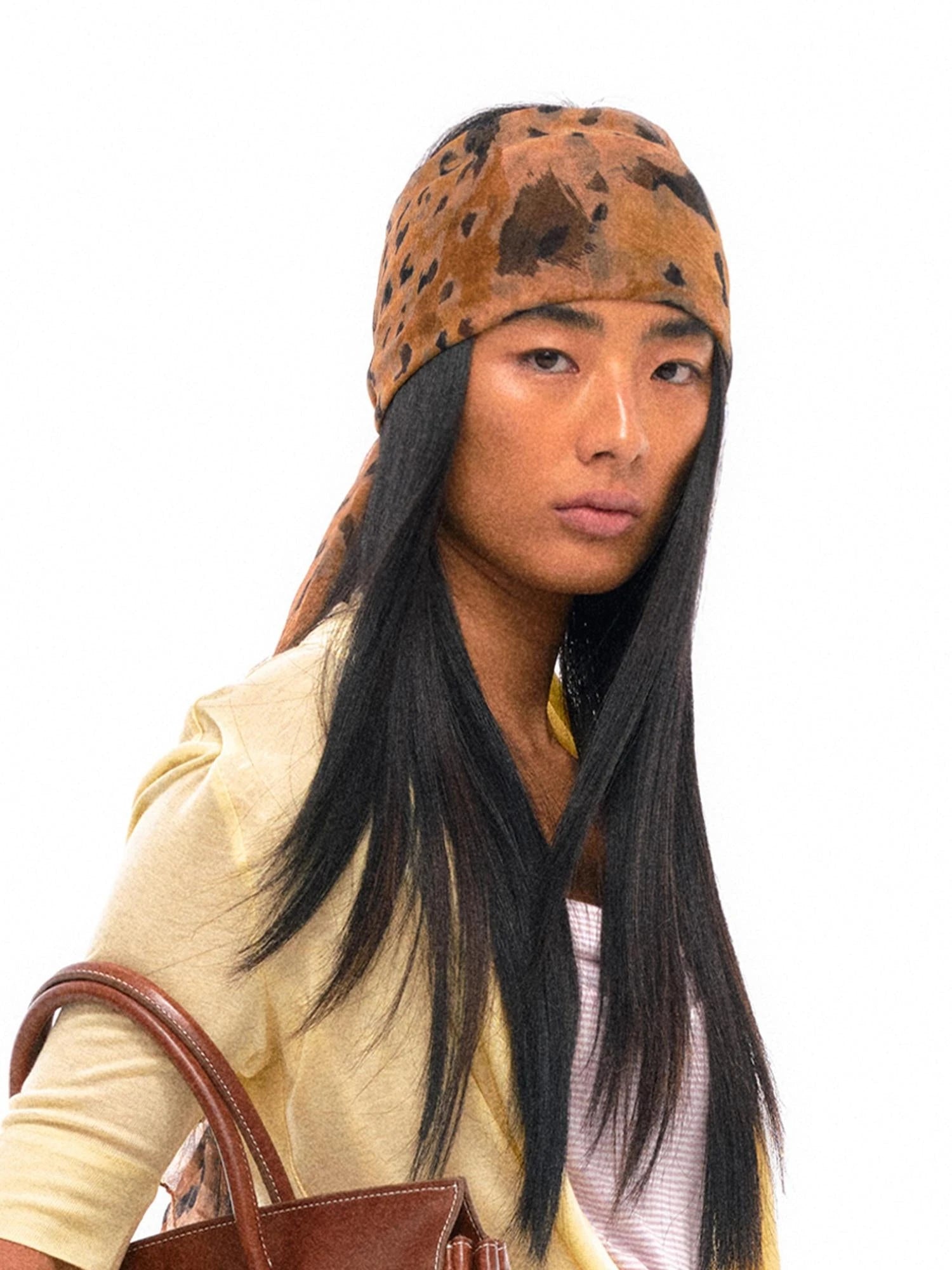 Brown leopard-print rectangular scarf; free size. Rectangular shape with leopard print; first-layer cowhide logo patch. Can be tied on the neck, bag, or waist. Manual measurement tolerance 1¨C3 cm. Made in China.